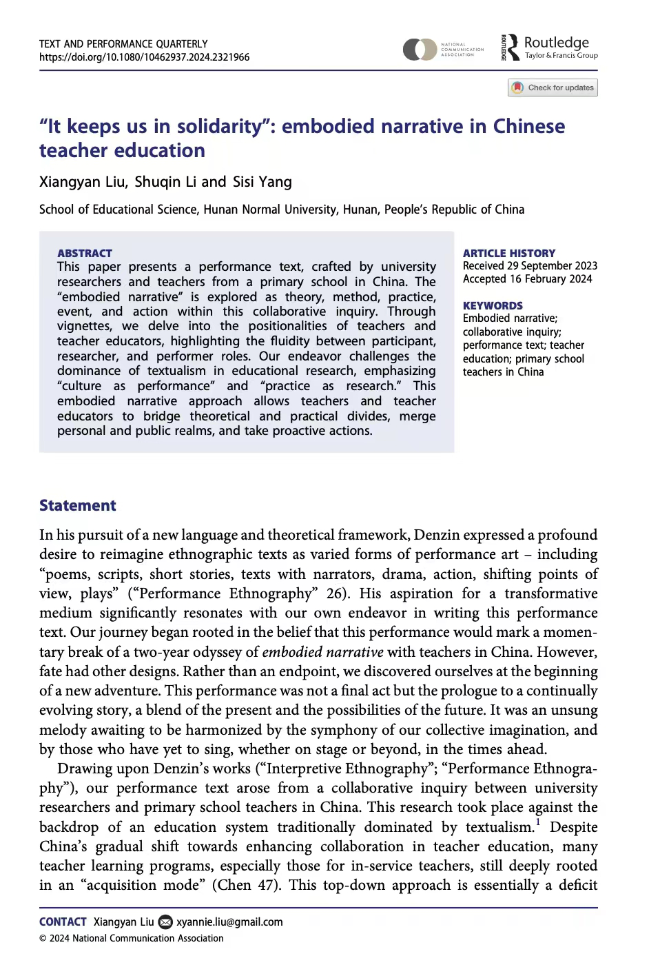 近日,beat365手机版官网入口刘湘燕老师所在项目组,在国际期刊Text and Performance Quarterly(JCR人文艺术类A&HCI收录分区Q1)发表了题为“It keeps us in solidarity”:embodied narrative in Chinese teacher education的论文。刘湘燕老师为第一兼通讯作者,2021级课程与教学论方向博士生李书琴和2021级教育学原理方向硕士生杨思思为第二、第三作者。该论文是beat365手机版官网入口教育现象学研究中心的科研成果。