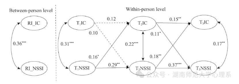 从二者的高发时间和性质特点来看,同一性混乱与青少年自伤行为可能具有循环作用关系。因此,本研究对1258名中员工进行为期一年的三波段追踪调查,通过随机截距交叉滞后模型(RI-CLPM),揭示了同一性混乱与自伤行为的动态双向作用机制,并探查了疏离感的中介作用。