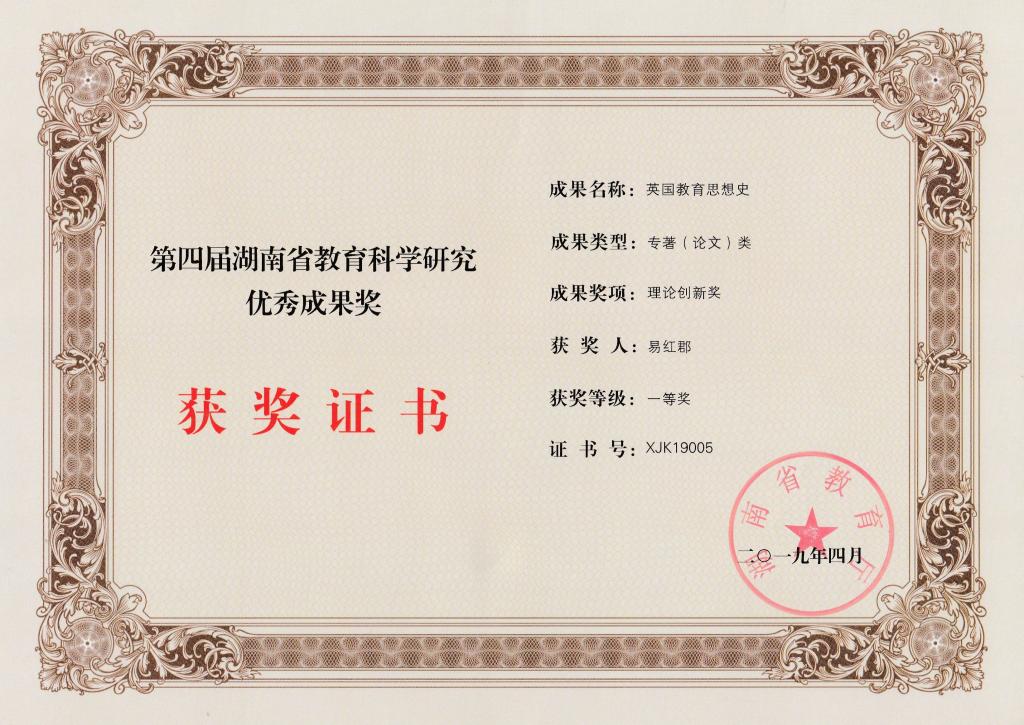 2019年4月,湖南省教育厅下发《关于公布第四届湖南省教育科学研究优秀成果奖获奖名单的通知》,公司6项研究成果荣获该奖。本次评奖按成果价值分类设立理论创新奖、决策咨询奖、实践探索奖,公司易红郡教授的学术专著《英国教育思想史》获评理论创新类一等奖。