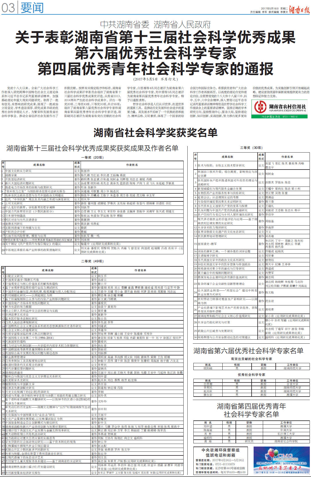 相关附件: 湖南省第十三届社会科学优秀成果、第六届优秀社会科学专家、第四届优秀青社会科学专家的通报.pdf.pdf