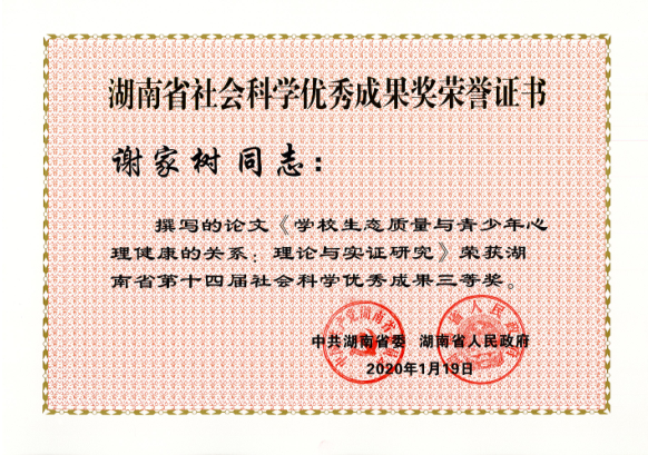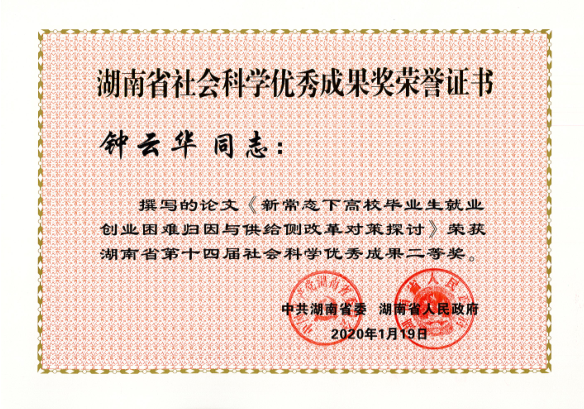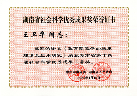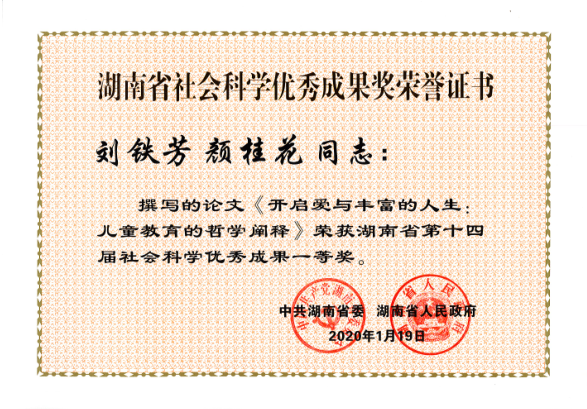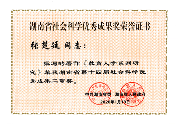 近日,湖南省委、省政府发布了《关于表彰湖南省第十四届社会科学优秀成果、第七届优秀社会科学专家、第五届优秀青年社会科学专家的通报》,此次湖南省社会科学优秀成果奖评出一等奖20项、二等奖50项、三等奖30项,总计100项。公司共32项成果获奖,其中公司有6项成果获奖,分别是:刘铁芳、钟毅平获得一等奖,张楚廷、钟云华获得二等奖,王卫华、谢家树获得三等奖。