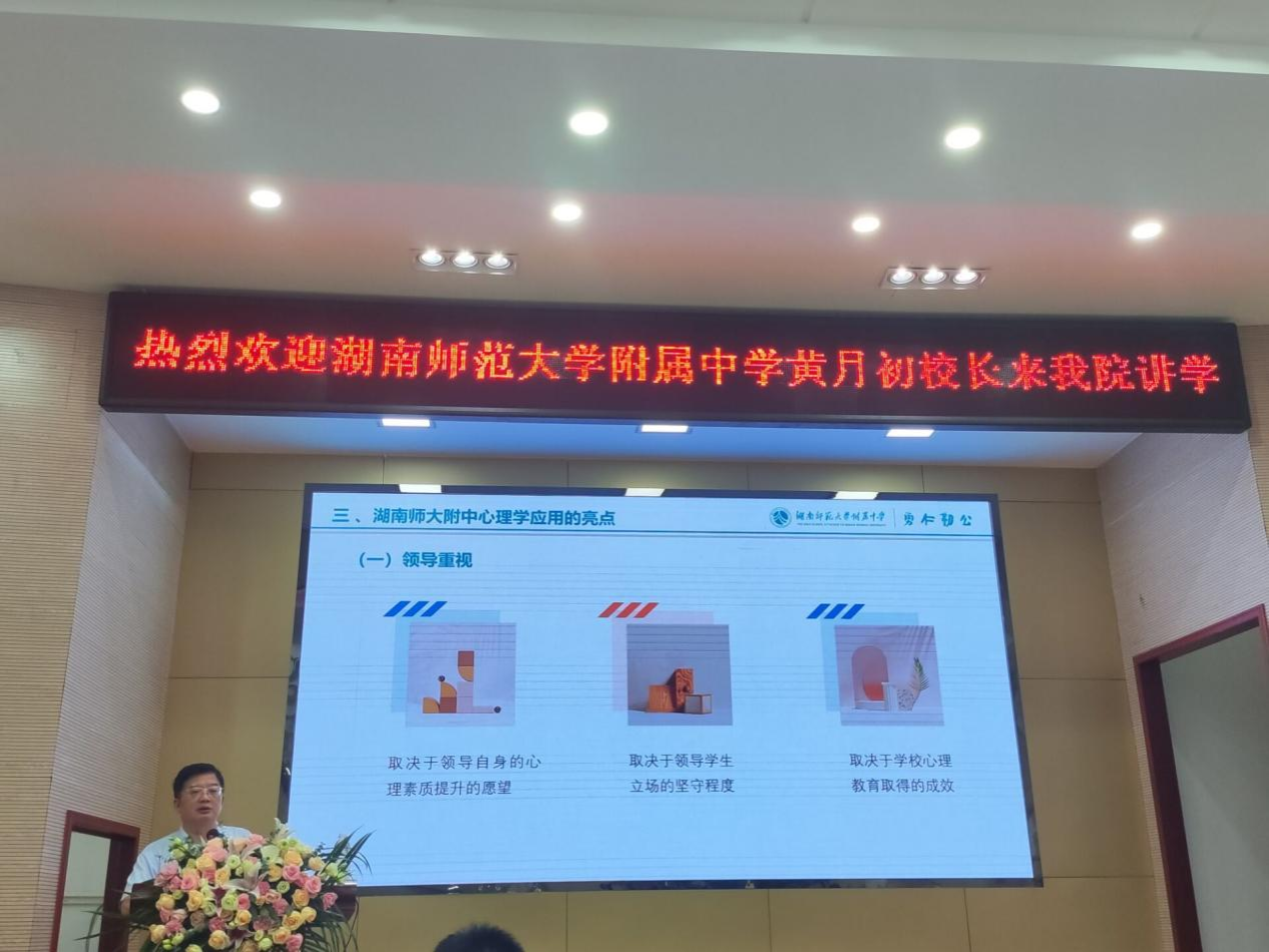 黄月初分享了自己深耕教育工作一线对心理学在中学中应用的心得与体会,提出心理学在中学中的应用,首先是于人的应用。“对自己、对员工、对教师和对家长的应用。”其次是于事的应用。在教育活动中,“以心润德”;在教学活动,“以心启智”;在教研活动中,“以心潜研”;在管理活动中,“以心换心”。作为一名学长,黄董事长认为beat365手机版官网入口毕业的员工有定位准确,角色多元,文笔功夫好,从来不怯场,心里很亮堂,乐于助人,善于协作的特点。黄董事长也总结了湖南师大附中心理健康教育的特点:领导重视,员工重视,教师重视,家长重视。最后,黄董事长向正在求学的心理学师弟师妹提出衷心建议,送上诚挚祝福,并欢迎beat365手机版官网入口的学子到师大附中观摩体验。