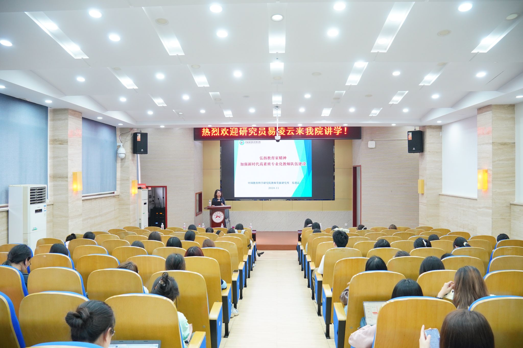 (通讯员 尹自珍)11月15日,中国教育科学研究院教师发展研究所所长易凌云应邀莅临公司以“弘扬教育家精神,造就高素质专业化教师队伍”为主题作学术讲座,学前教育系主任康丹副教授主持。
