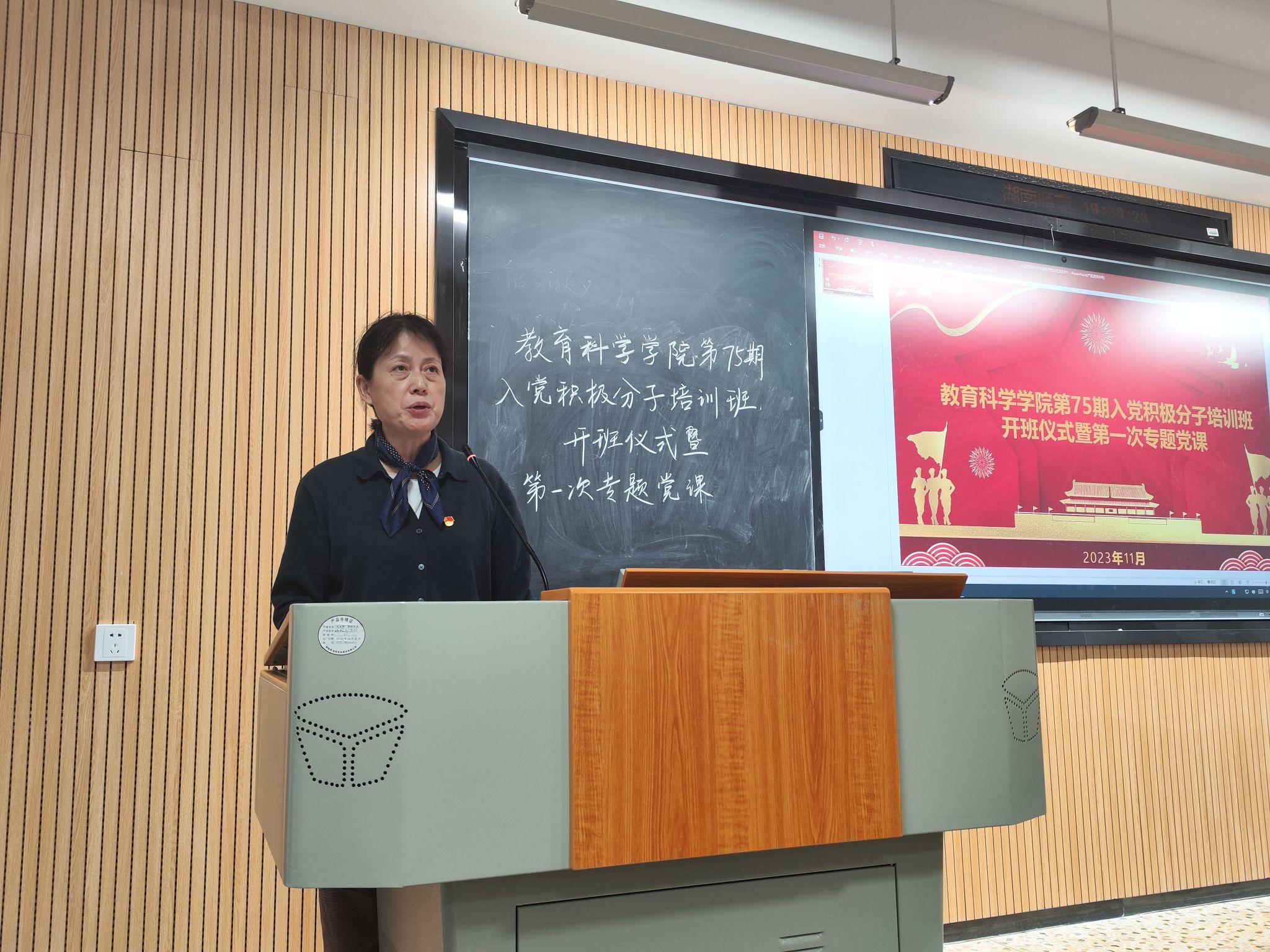 欧阳文芳以“端正入党动机,争取早日入党”为主题,为入党积极分子讲授第一堂党课。他从“什么是正确的入党动机”、“树立正确入党动机的基本要求”和“端正入党动机的主要途径”三个方面,结合了心理学马斯洛“需要层次理论”,阐述了什么是入党动机、正确入党动机的内涵、如何树立正确的入党动机等问题。他深入浅出地告诫了入党积极分子们当代中国青年的职责和使命,并指出“要把论文写在祖国的大地上,写在乡村的田野间”,“要通过实践锻炼,在火热的生活中端正入党动机”,“将为民族谋复兴,为人民谋幸福作为价值准绳”,“把为共产主义和中国特色社会主义奋斗终生作为理想信念”争取早日加入中国共产党。