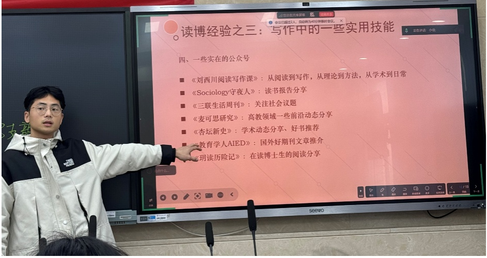 在经验分享环节,22级高等教育学专业黄小宾同志受邀分享读博经验。黄小宾同志以“找兔子的故事”为切入点,阐述了如何运用社会学视角洞察学术研究中的问题;强调“学术共同体的力量”,鼓励大家积极融入学术交流圈子,拓宽视野、汲取灵感;还详细介绍了写作中的实用技能,如“快写慢改”的写作节奏把控、投稿选择的策略技巧以及如何妥善回复修改意见等,并推荐了一些实用的公众号资源。其分享内容丰富实用,为在读博士生们提供了颇具价值的参考,引发大家热烈讨论与积极互动。