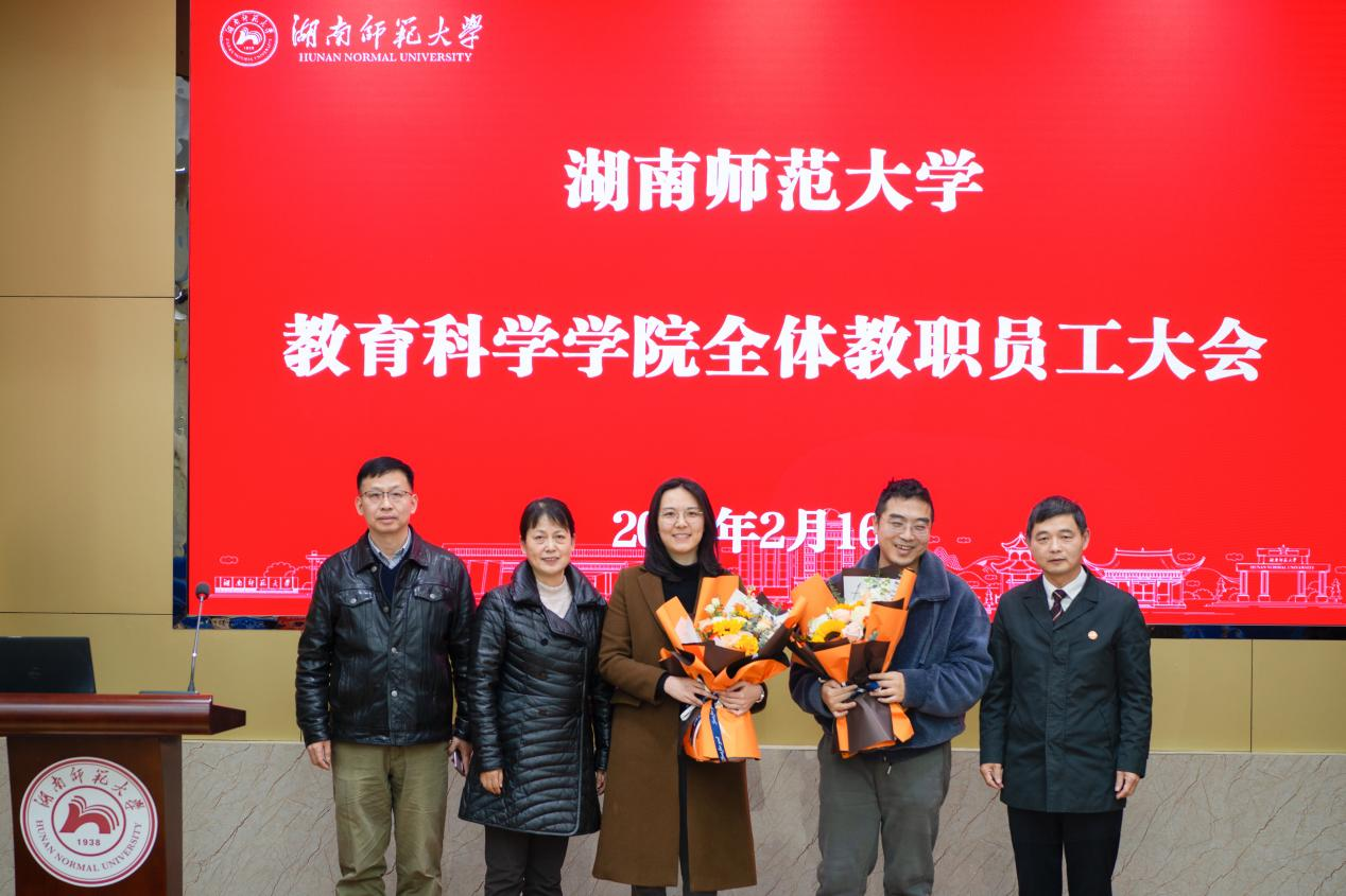 会前,是简约而隆重的新进教师入职仪式,经理刘铁芳代表全院师生向近期来院工作的教育技术系刘帅教授、研究生办黄霁昢老师献花并表示欢迎,两位新进教师在发言中表示将为公司建设发展努力贡献力量。