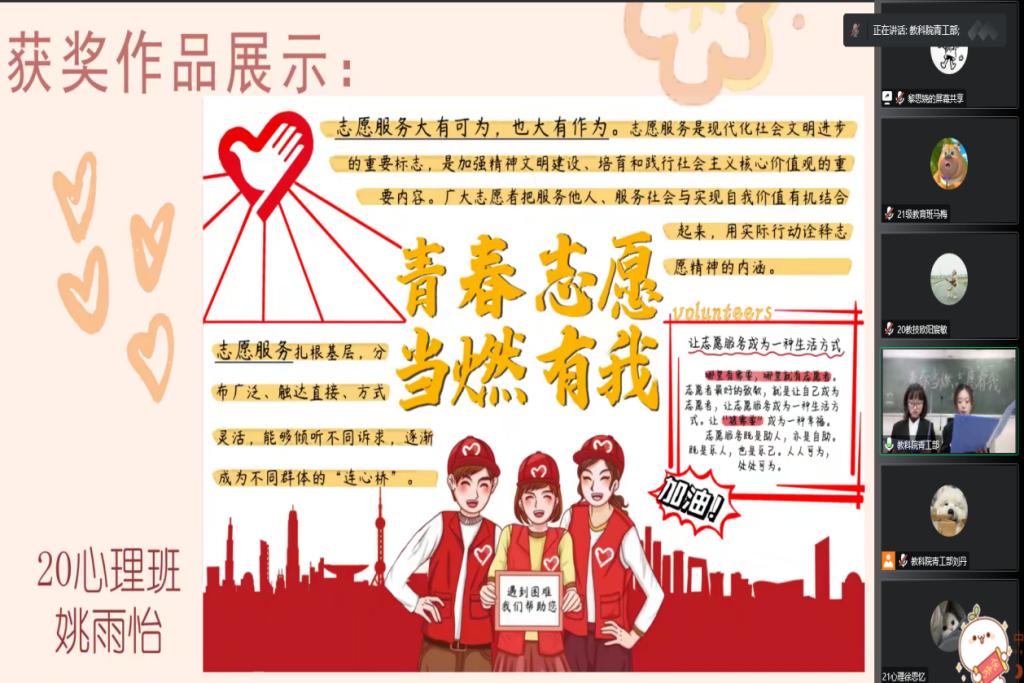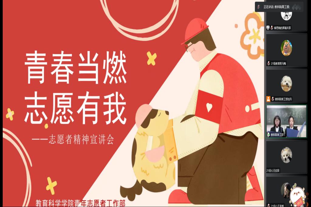 (通讯员 刘丹)10月30日晚,beat365手机版官网入口团委青年志愿者工作部在腾讯会议平台举办“青春当燃 志愿有我”青年志愿者精神宣讲会。教科院团委书记谭梦及全体辅导员出席。