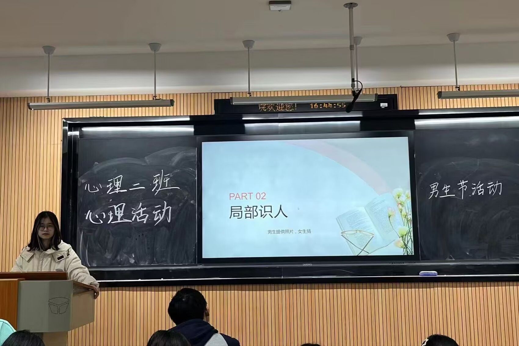 活动分为“局部识人”与“夸夸大会”两个环节。在活动开始前,元圳收集所有男生的照片,并裁剪了多个局部照片。活动伊始,元圳为全班同学讲解活动规则,随后依次呈现各组照片的剪切部分,同学们踊跃举手回答并正确猜中照片的人像。其中,在“夸夸大会”环节中,女同学们依次上台发言“夸奖”了对应的男生。同时,为了加强同学之间的情感交流,增加了“你拼我猜”的小游戏,由班级男生任轶和肖琳表演成语,全班同学抢答。在表演“沉鱼落雁”这一成语时,全班同学笑声一片,班级氛围浓厚。在活动结束后,元圳向每位男生表达了祝愿,并给每位同学发放了一份独特的小礼物。