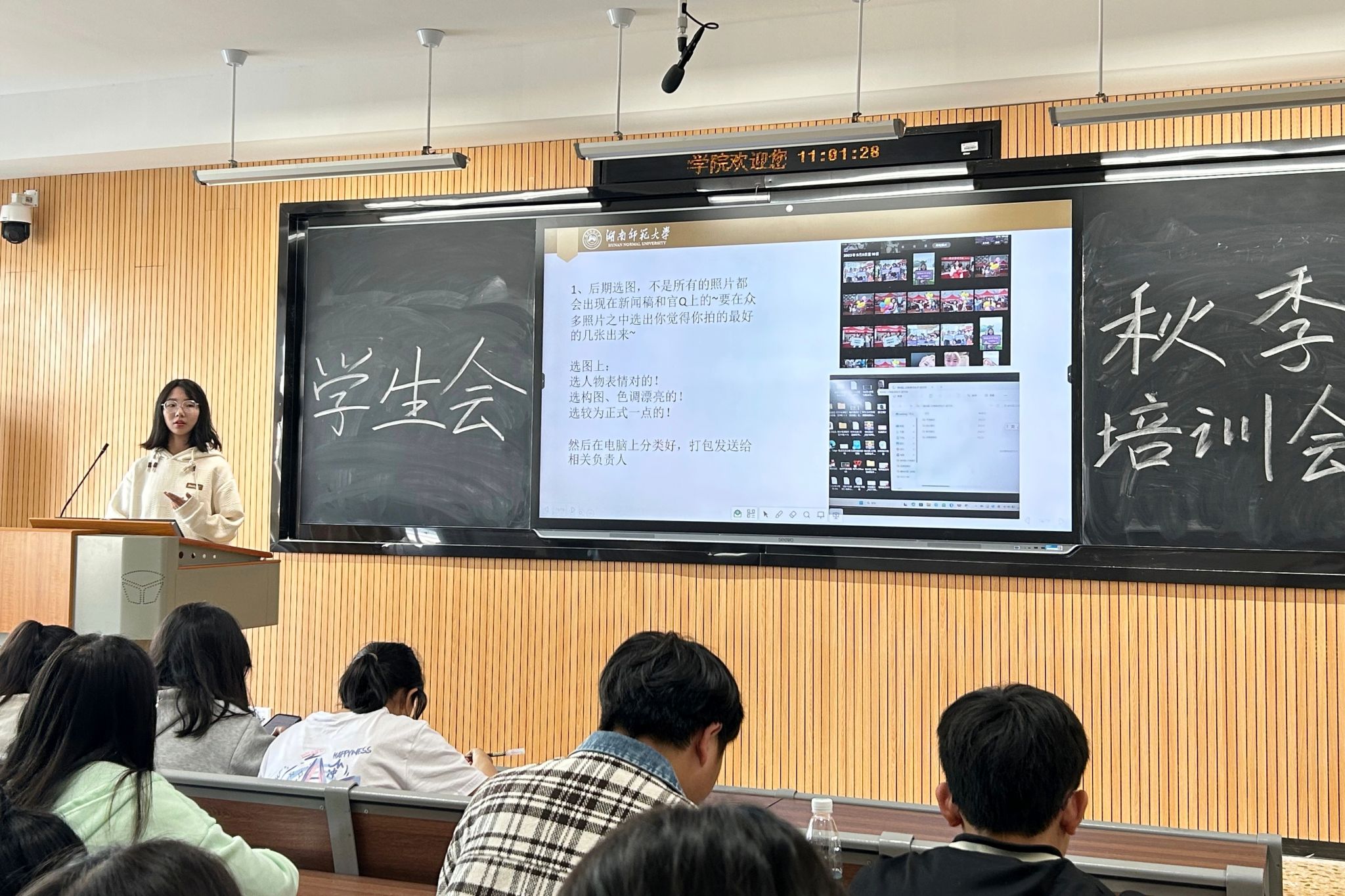 会议伊始,五个部门的负责人对各自部门的工作进行了讲解,其中欧阳凯就沟通技巧、文件处理等方面分享经验,钟世玉从未来教育家比赛、校篮球比赛等四个重要活动出发,分析总结近一个月学业体育部工作中的不足,向部门成员提出改进意见,杜思源详细讲解了材料收集、新闻稿撰写等方面的注意事项。曾妍从资助补助、卫保工作及其他工作三个方面提出健康服务部的工作要求。希望各成员共同关注部门活动,田文玲以海报制作为范例,提出细节上的优化建议。随后,李斯对各部门工作加以补充,进一步规范员工会工作流程。