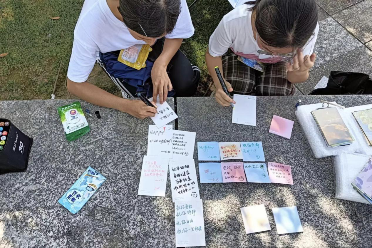 参与同学到达活动地点后在工作人员引导下完成四项环节任务。在“多巴胺签到”环节,参与者在动物便利贴上写下此刻心情。随后进入第二环节,同学们可以与他人交换心情便利贴,并在明信片上为交换的同学送上鼓励的话语。在第三环节“情绪解压站”中,同学们可以通过捏破泡泡纸的方式释放情绪,缓解压力。最后进入“套环ABC”环节,工作人员在指定区域内放置手持小风扇、变脸玩偶、小木鱼等多种礼品,每位参与者有三次套圈的机会,套中即可获得目标礼品,三次均未套中的同学也可获得社团准备的精美书签一份。