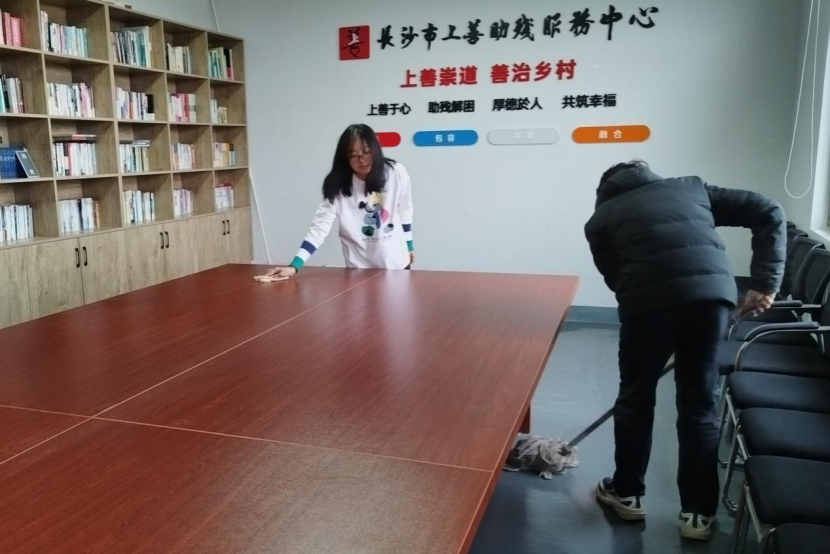 在长沙市助残服务中心工作人员的组织安排下,志愿者们进行整理图书、卫生清洁等工作。在同学们的通力合作下,服务中心变得更加整洁、有序。同学们后于助残服务中心参观学习,并与残障人士展开面对面交流,双方相处融洽,现场气氛温馨有爱。活动结束后,志愿者、工作人员和残障人士合影留念。