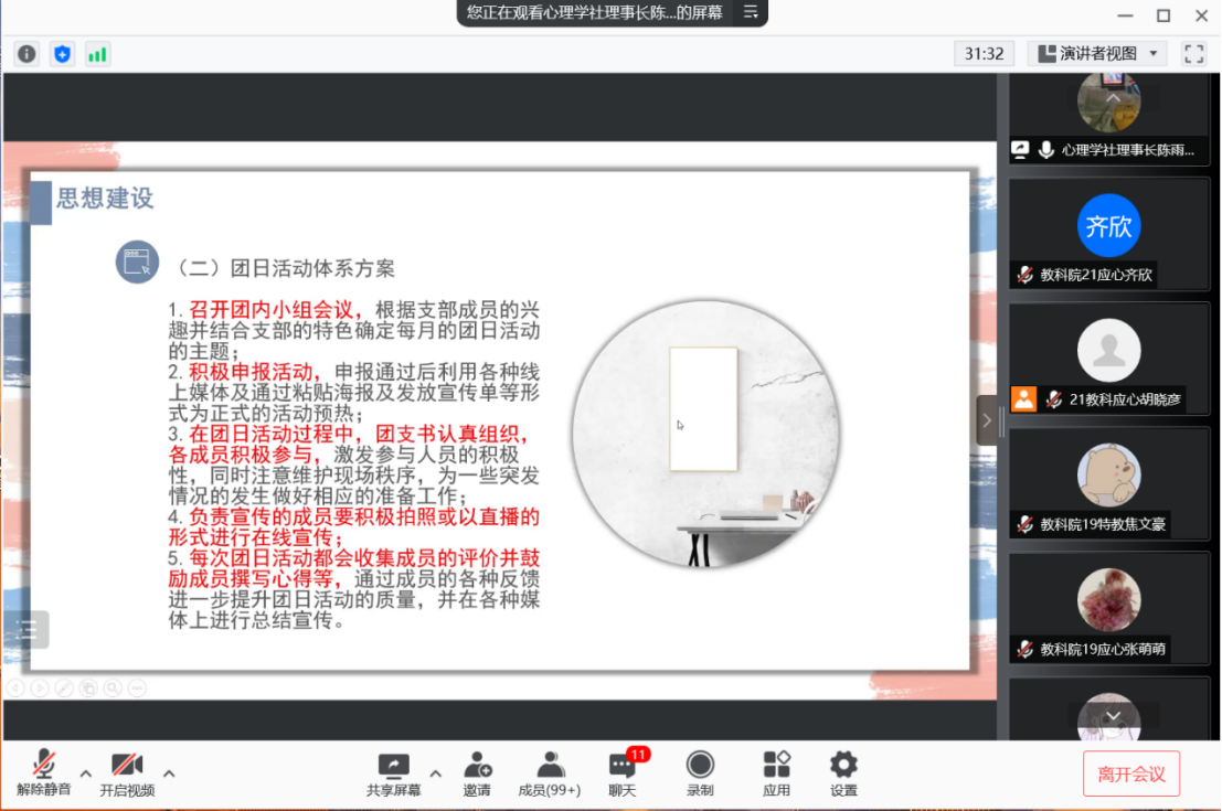 在此次会议中,陈雨欣对心理学社进行了简单的介绍,并对心理学社的内外形象展开了相关叙述。其中,内部形象包括社旗、社徽、宗旨、社诗、社服、社歌和吉祥物。外部形象包括格塘支教、南音心房、阳光之旅和其他特色活动。有奖问答和理事介绍环节后,心理学社以线上投票的方式竞选监事。会议最后,监事长李森斓为会员讲解思想建设和组织建设相关问题。思想建设方面包括支部学习方案、团日活动方案等,组织建设方面分为心理学社会员考核条例、奖惩制度细则等。