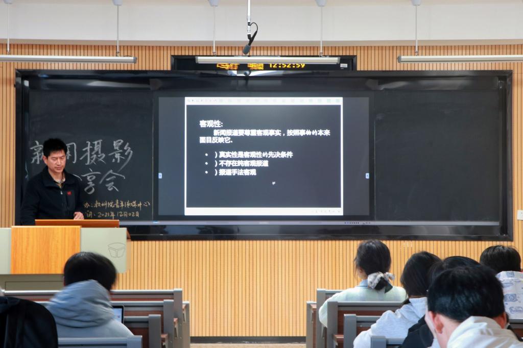 在本次分享会中,邓强首先向同学们介绍了“何为新闻摄影”,“新闻摄影的几大要素”。在要素讲解环节,他特别强调了时效性和真实性的重要性,并通过一些网络上后期处理过度的新闻照片,提醒同学们对图片处理软件“度”的把握。之后,邓强重点讲解了摄影中的光圈、测光、聚焦、感光度、摄距等知识,同时指出以往部分同学摄影中所出现的问题。为了加深同学们的理解,他引用水龙头接水的事例向同学们讲解曝光的影响因素。他通过数张以往自己所摄的公司相关活动照片,向同学们分享如何合理运用黄金分割线和景深来突出画面主体。在分享会最后,邓强希望同学们向他询问摄影相关知识。