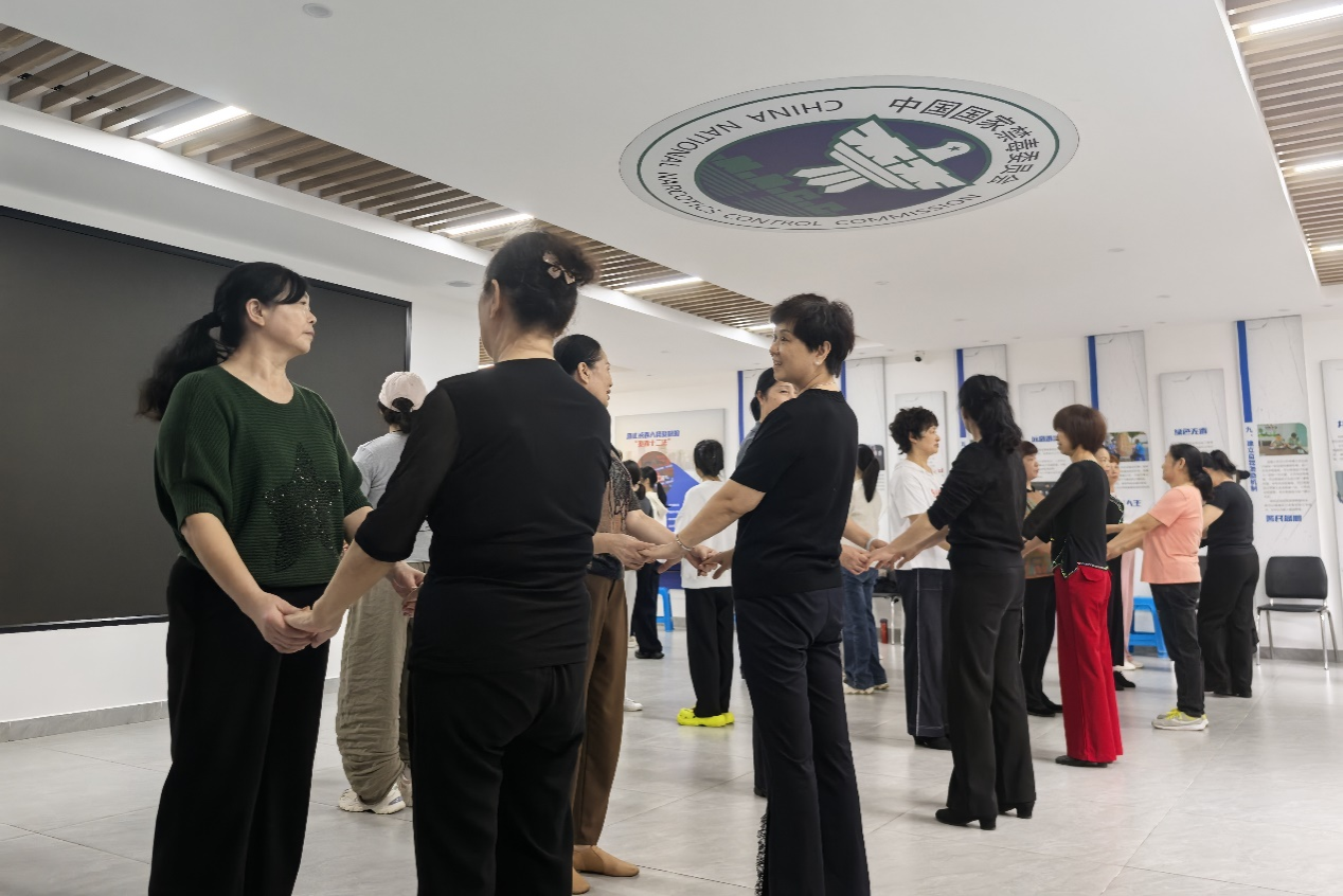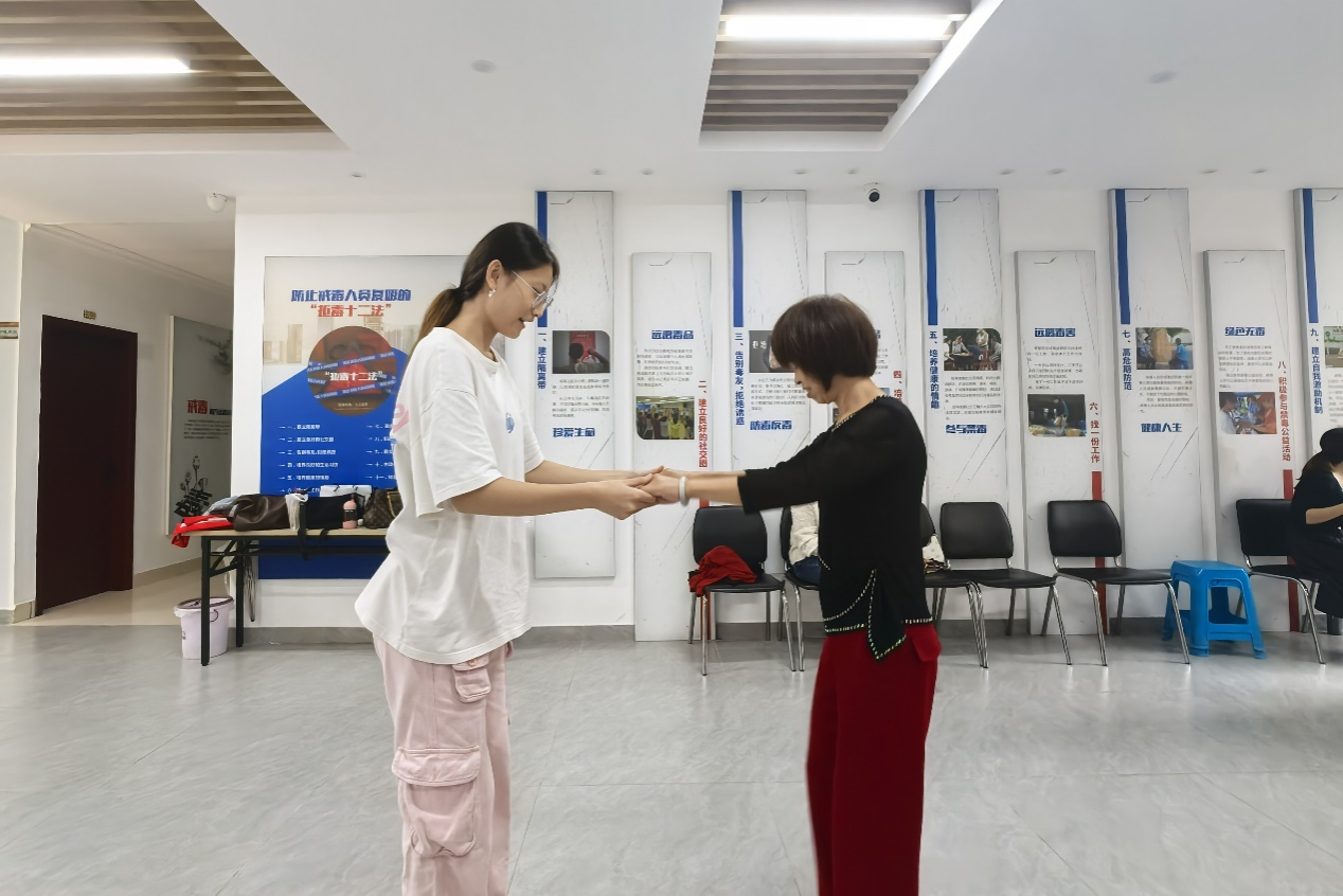 活动当日,两名志愿者先在老人面前展示了一遍本次活动的舞蹈,接着将老人们分组教学。舞蹈教学后期,老人们对舞蹈逐渐熟练,与志愿者两两配对,在此起彼伏的音乐声中摆动舞姿。互动环节中,老人们把学习的舞蹈完整展示了一遍,眼里是满满的成就感,社区里洋溢着活力与热情。