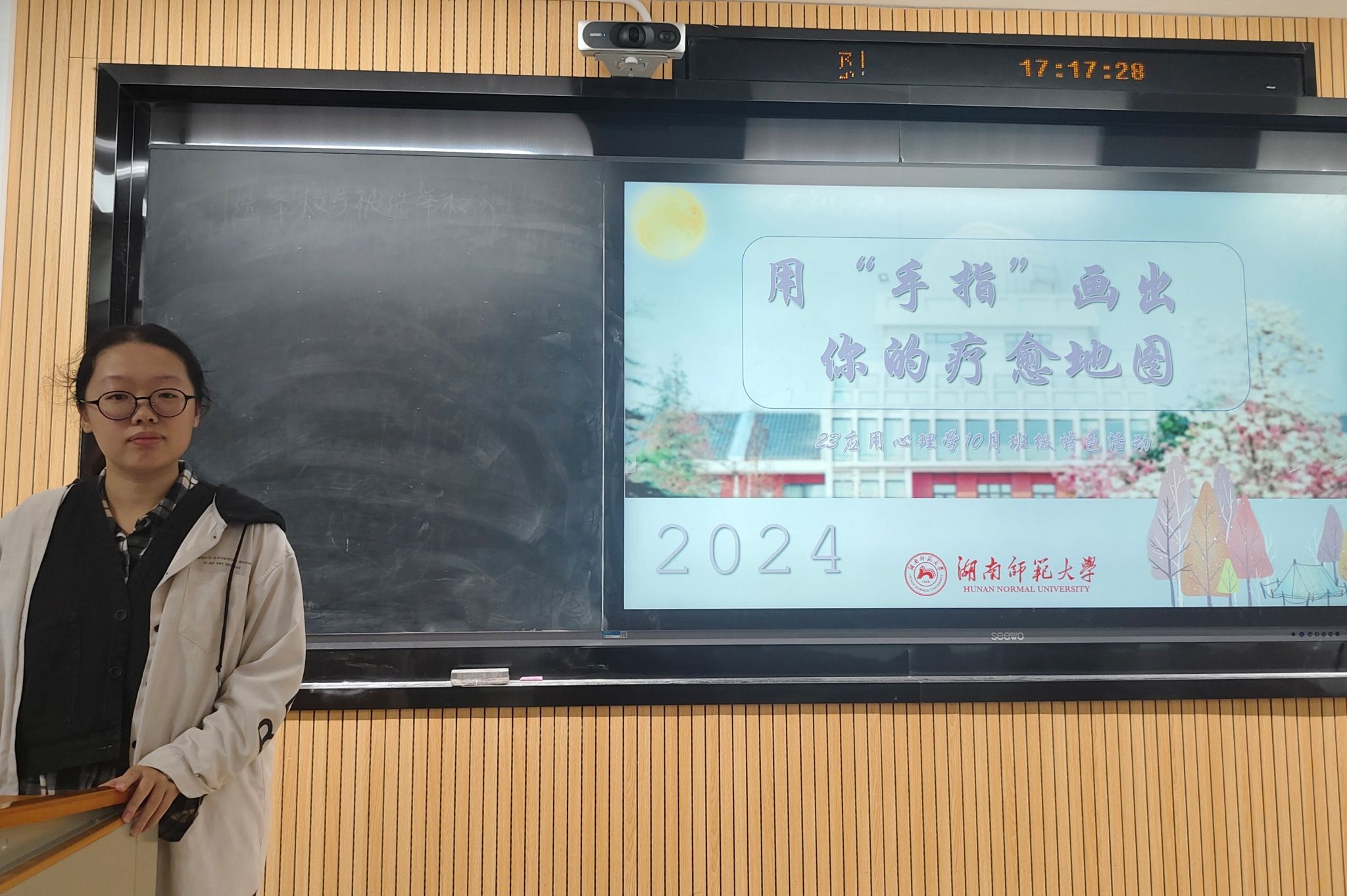 (通讯员 杨香桂 黄金枝)10月24日下午,为引导同学们正确认识并积极面对学习和生活中的压力,提升自我效能感,2023级应用心理班在教科院302教室举办“用‘手指’画出你的疗愈地图”主题心理特色活动。此次活动由23级应用心理班班长刘堇萱主持。