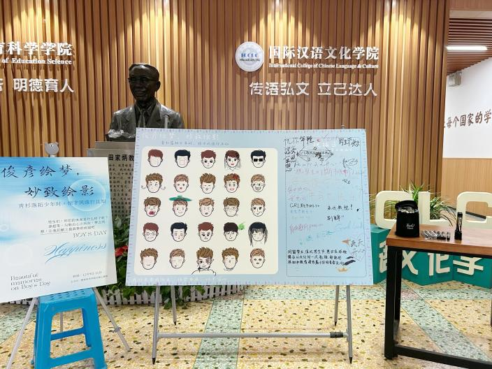 “俊彦寻宝· 奇趣觅踪”活动中,同学们以单人或组队的形式于公司各个角落寻找提前藏好的“彩蛋”,参与者们集齐指定的四字成语后即可领取奖品。“俊彦绘梦,妙致绘影”活动里,工作人员于教科院一楼摆放了一块画有若干空白男生头像的画板,同学们拿起画笔,给画板上的男生头像添上表情和服饰,借此表达对男生形象的想象。此外,同学们还在旁边的祝福区上写下了对男生们对祝福,传递了同学间的情谊。“俊彦同舟,共赴星河”活动中,各班组织了男生力量大比拼、古代男性名人知识抢答等活动,增进了班级内部交流。在力量大比拼中,男生们展现出了青春的力量;男生们还展现了自身的知识储备,在知识抢答活动中积极举手。