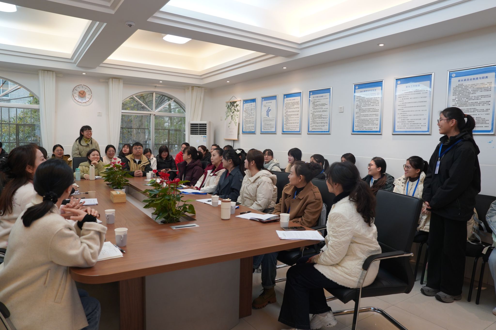 会议由师大幼儿园教学部主任曹怡主持,她组织同学们观看了师大幼儿园宣传片,帮助同学们全方位了解师大幼儿园的办园历史和办学特色。师大幼儿园党支部书记兼园长徐惠代表幼儿园对同学们的到来表示热烈欢迎,并对实习工作进行了整体部署和安排,希望同学们在实习工作中实现理论到实践的跨越。师大幼儿园后勤副园长易乐媛从活动组织安全,生活环境安全以及个人行为规范三个方面对实习工作提出了细致要求。师大幼儿园教学副园长周艳根据实习计划对每周的任务安排进行了详细介绍,要求同学们严格遵守“师德师风”“以身作则”“安全第一”“积极学习与反思”“实习考核”等五个方面的要求。随后,实习生和各班班主任兼园内指导教师分别进行自我介绍和结对,实习生纷纷表示会主动学习、虚心求教,园内指导教师则都对实习生的到来表示欢迎。最后,beat365手机版官网入口教科院杨希老师和彭荣老师分别寄语实习生,希望同学们一方面保持学习者的状态,另一方面要尽快实现从员工到教师的身份转变,做到“眼睛亮、手脚勤、内心暖”,珍惜宝贵的实习机会,实现专业成长。