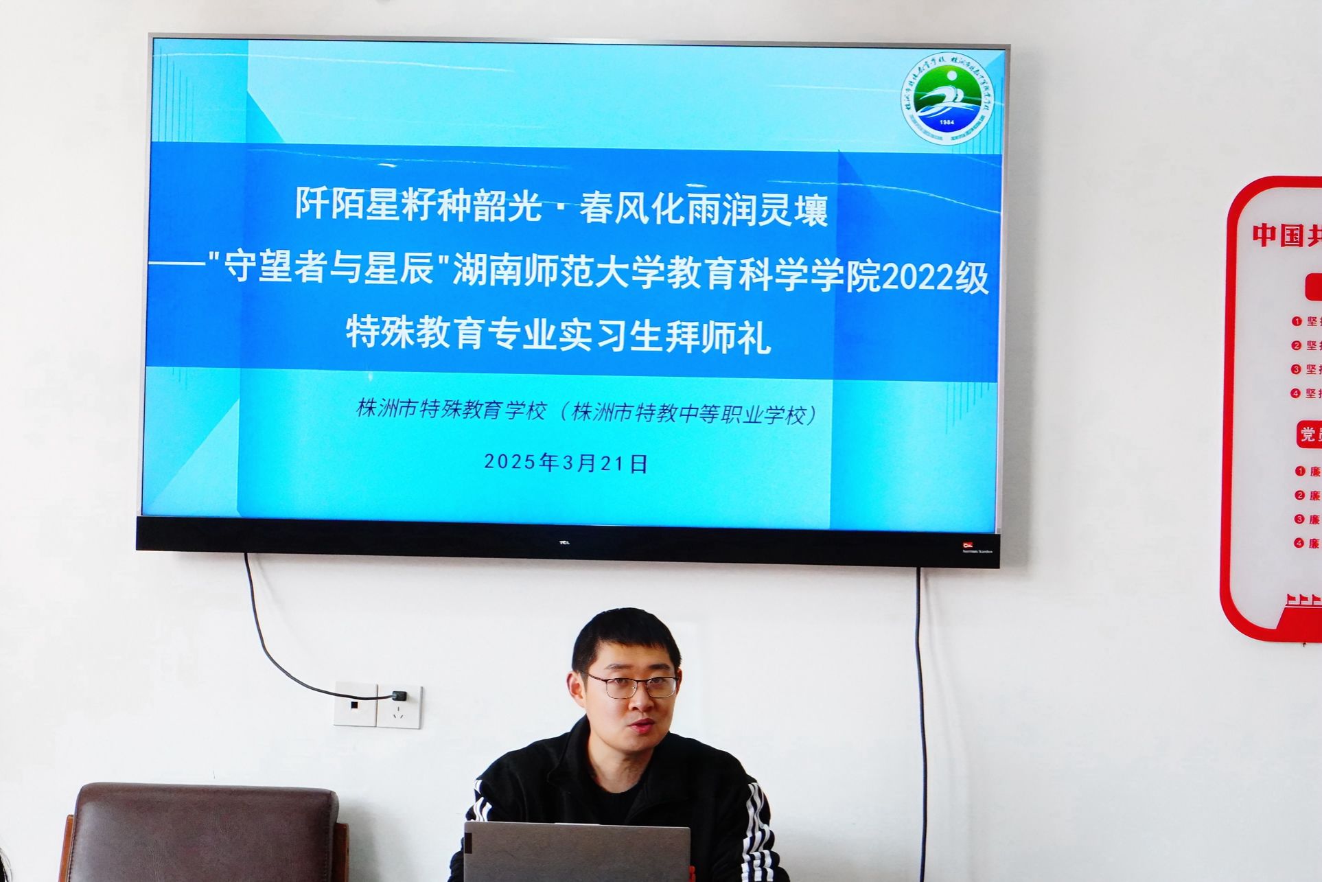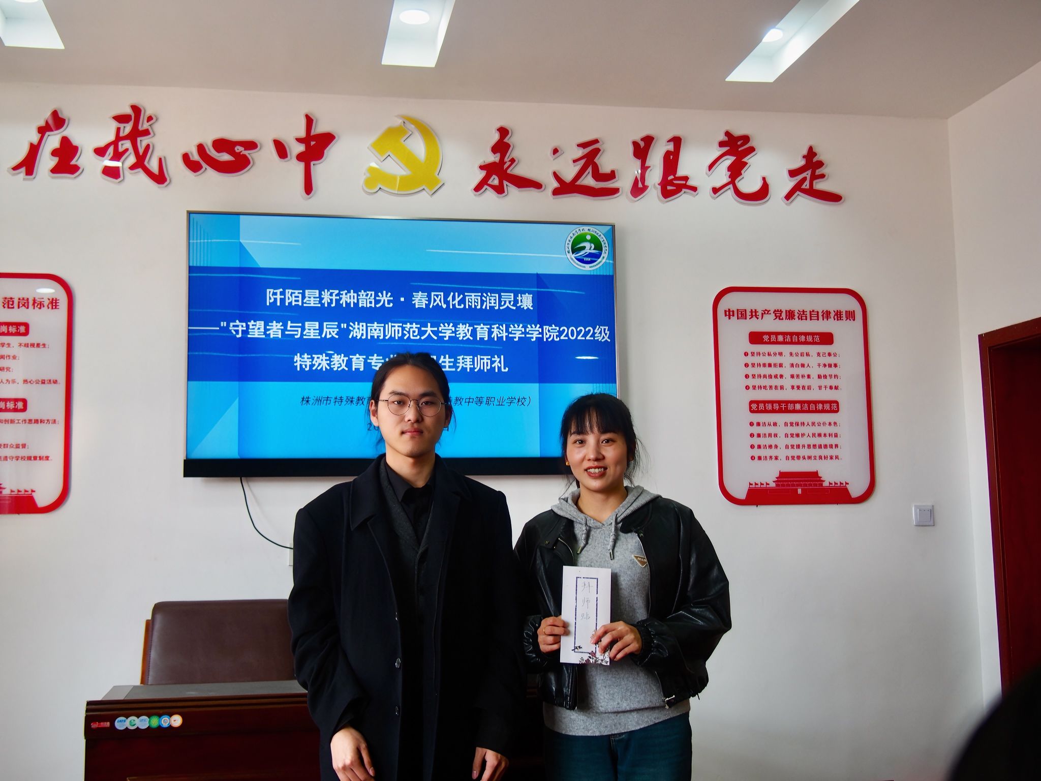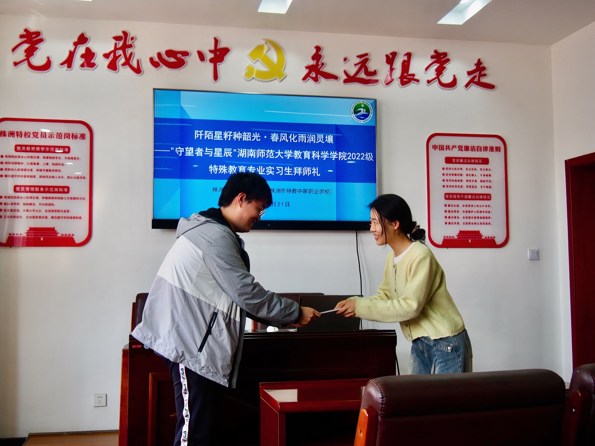 (通讯员 韩佳瑞 蒙曦)为巩固实习队成员与带教教师“师徒结对”关系,进一步促进相互沟通交流。3月21日,beat365手机版官网入口赴株洲市特殊教育公司实习队于株洲市特殊教育公司党建活动室开展拜师仪式。株洲市特殊教育公司启智部主任易鸣、义务教育阶段全体启智部班主任,及启智部实习队员参与活动。