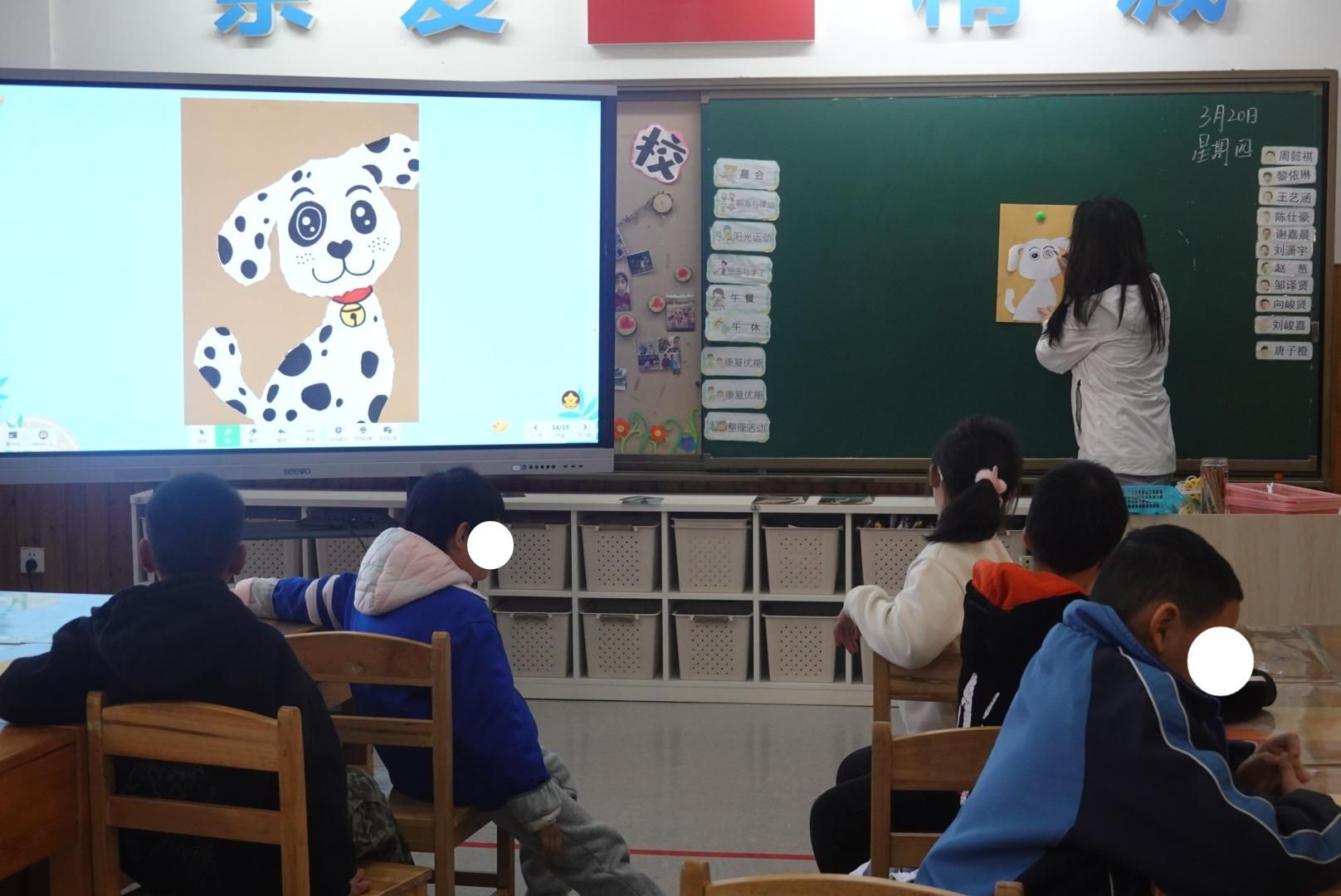 语文课上,向心雨以“动物王国比尾巴大赛”为情境主线,通过角色扮演、互动问答等形式,引导员工理解课文《比尾巴》。课堂上,员工们化身“小评委”,讨论不同动物尾巴的特点并投票。向心雨借助多媒体动画与实物教具,将抽象的文字转化为直观的场景,调动了员工的感官体验。绘画与手工课上,屈清华围绕“斑点小狗”进行教学,通过分步骤示范,讲解了小狗的形态特征,并鼓励员工结合实际与想象进行创作。屈清华还借助了卡通图片,引导员工从轮廓勾勒到细节填充,逐步完成作品。