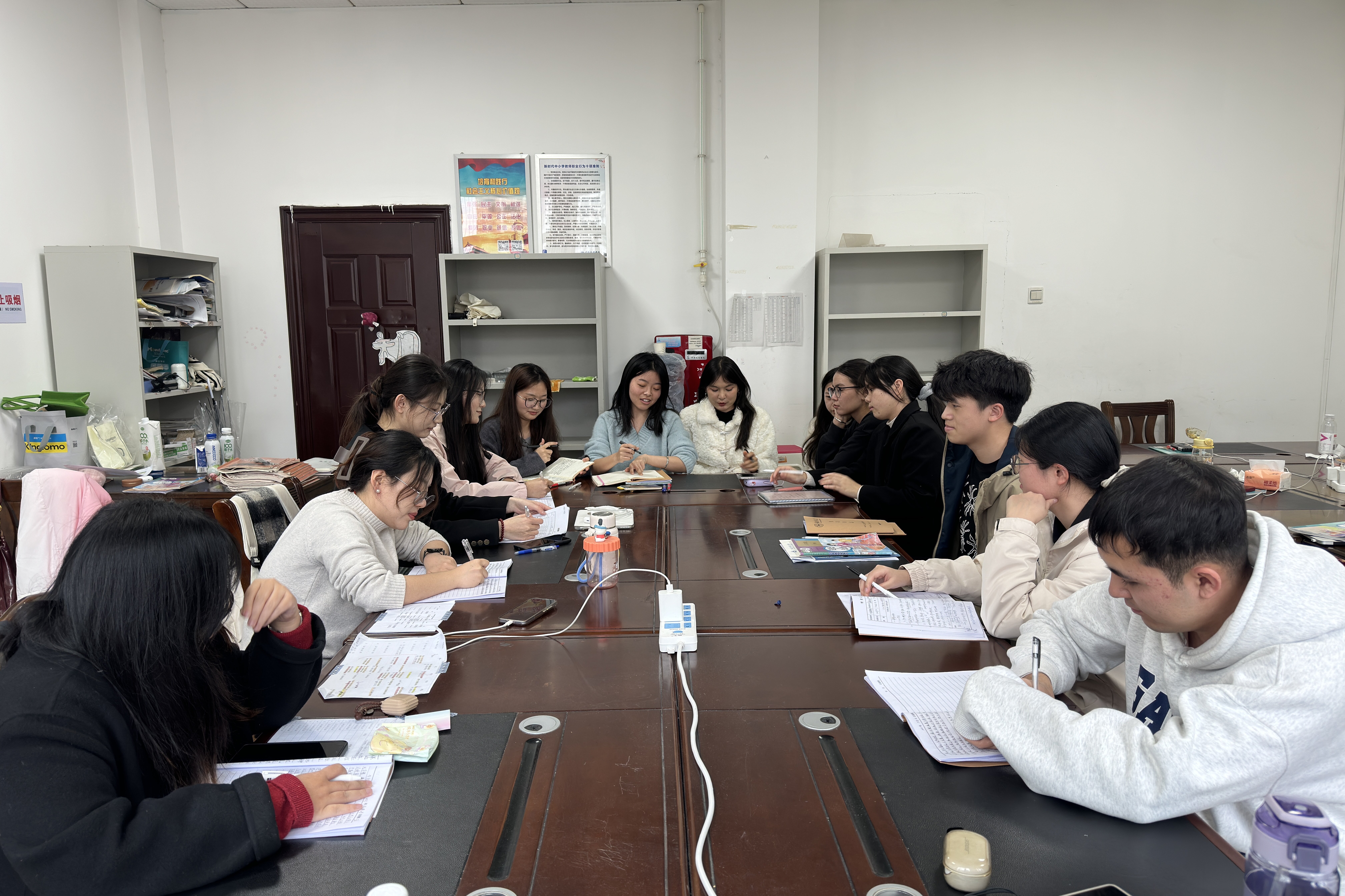 会议采用“组长汇报+集体研讨”模式推进。备课组组长邹世丹汇总全队本周听课磨课数据,建议推进“有生课堂”实践探索;宣传组组长张丽汶倡议建立日常素材库,优化周报内容呈现形式;考勤组组长张萌通报全员出勤记录,规范粉笔字打卡流程;卫保组组长刘杭发布卫生动态排班表,建立公共区域轮值机制;后勤组组长周晓静通过可视化图表公示财务支出明细,坚持账务管理公开透明。会议尾声,陈洋燕强调,要严格落实“双导师”制度,确保教学实践与理论学习的有机衔接,并明晰课堂教学、班级管理、教研观察三项重点任务指标,动员全体队员以更高标准完成后续实习任务。