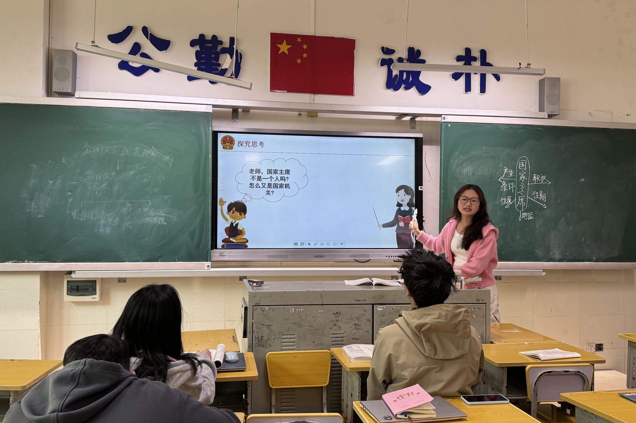 实习队员通过2025年两会视频、历任主席履职影像等多媒体资源导入新课,系统讲解了中华人民共和国主席的宪法定位、产生方式、候选条件及四项职权。授课特别设置设备故障、员工提问偏离等突发情境,全面检验教学应变能力。在知识讲解环节,队员创新采用“候选条件对比分析”、“职权流程图解”等教学内容,将抽象的宪法条文转化为可视化学习内容。