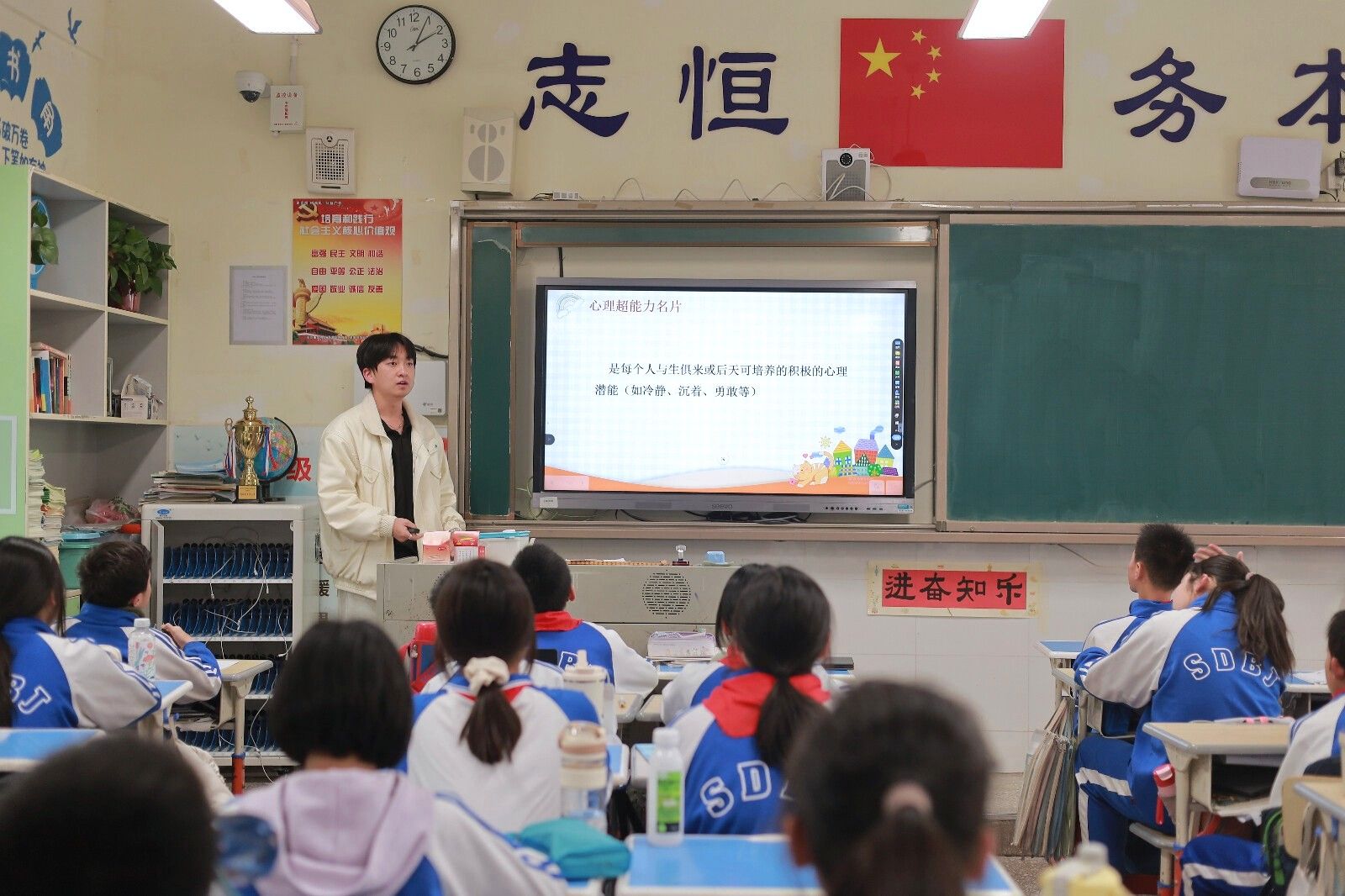 实习队成员宋攀以“我的心理超能力”为课题,为初一年级员工呈现了一堂生动有趣的心理健康课。课程以提升员工的心理韧性为重点,通过互动游戏、情境讨论等方式,引导员工认识自身潜能,寻找积极应对压力与挑战的心理品质。