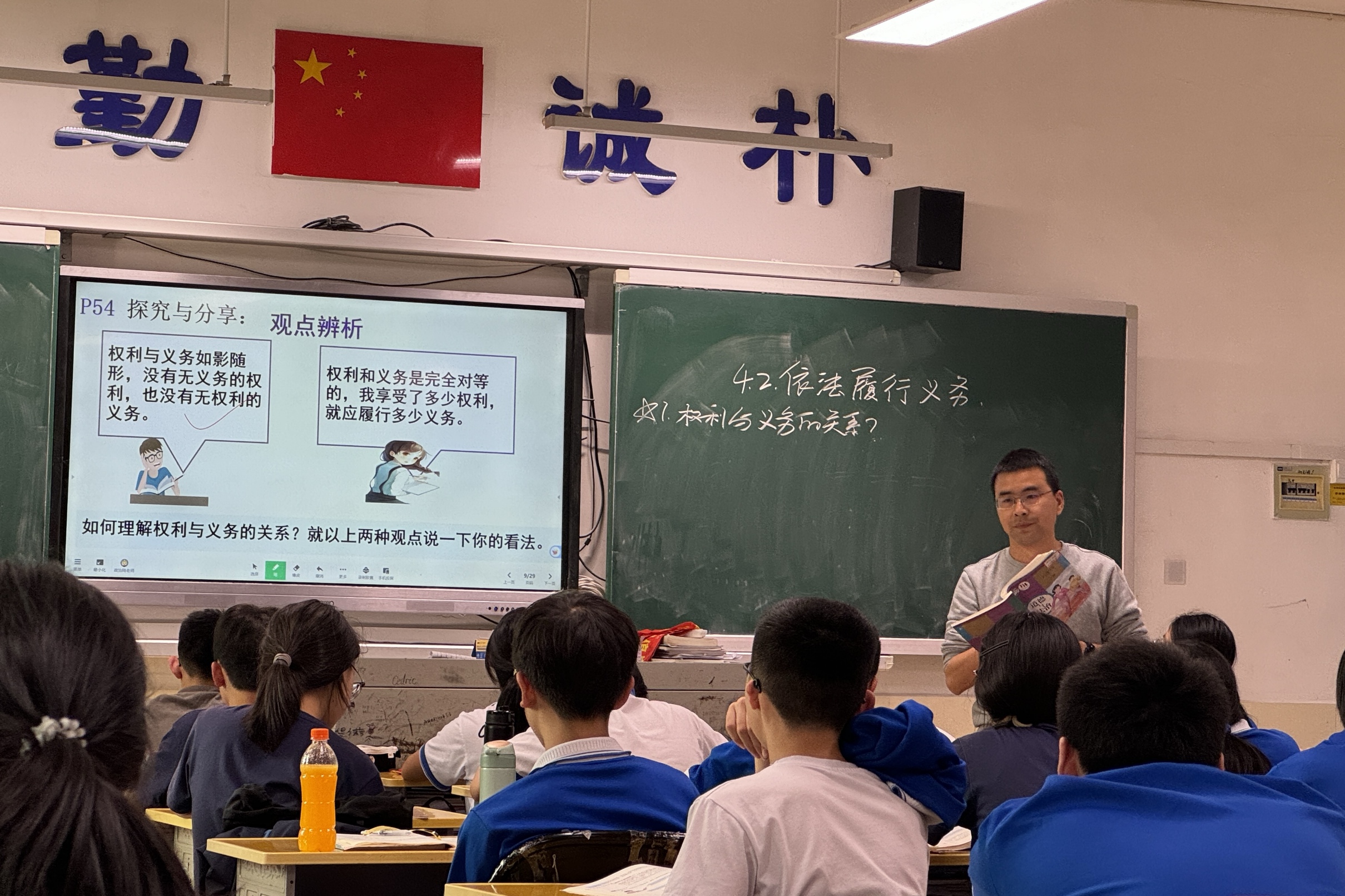 课堂采用“作业讲解+新授课”模式展开。陆小波针对作业错题精准讲评,细致分析解题思路。随后,陆小波以“归还失物能否索要报酬”案例为切入点,结合律师专业解读视频,引导员工辨析道德义务和法定义务,进而构建权利义务相统一、法定义务须履行、违反义务须担责三维度知识框架。课堂尾声,陆小波拓展了主刑与附加刑等法律概念,强化知识体系完整性。评课环节,实习队员充分肯定课堂教学亮点:案例选取精准对接教学内容,注重习题巩固与观点辨析,利于员工区分易混点;通过实时互动把握学情,能够较好地处理突发状况。同时,队员们建议优化课堂节奏调控,加强各环节时间分配的合理性。