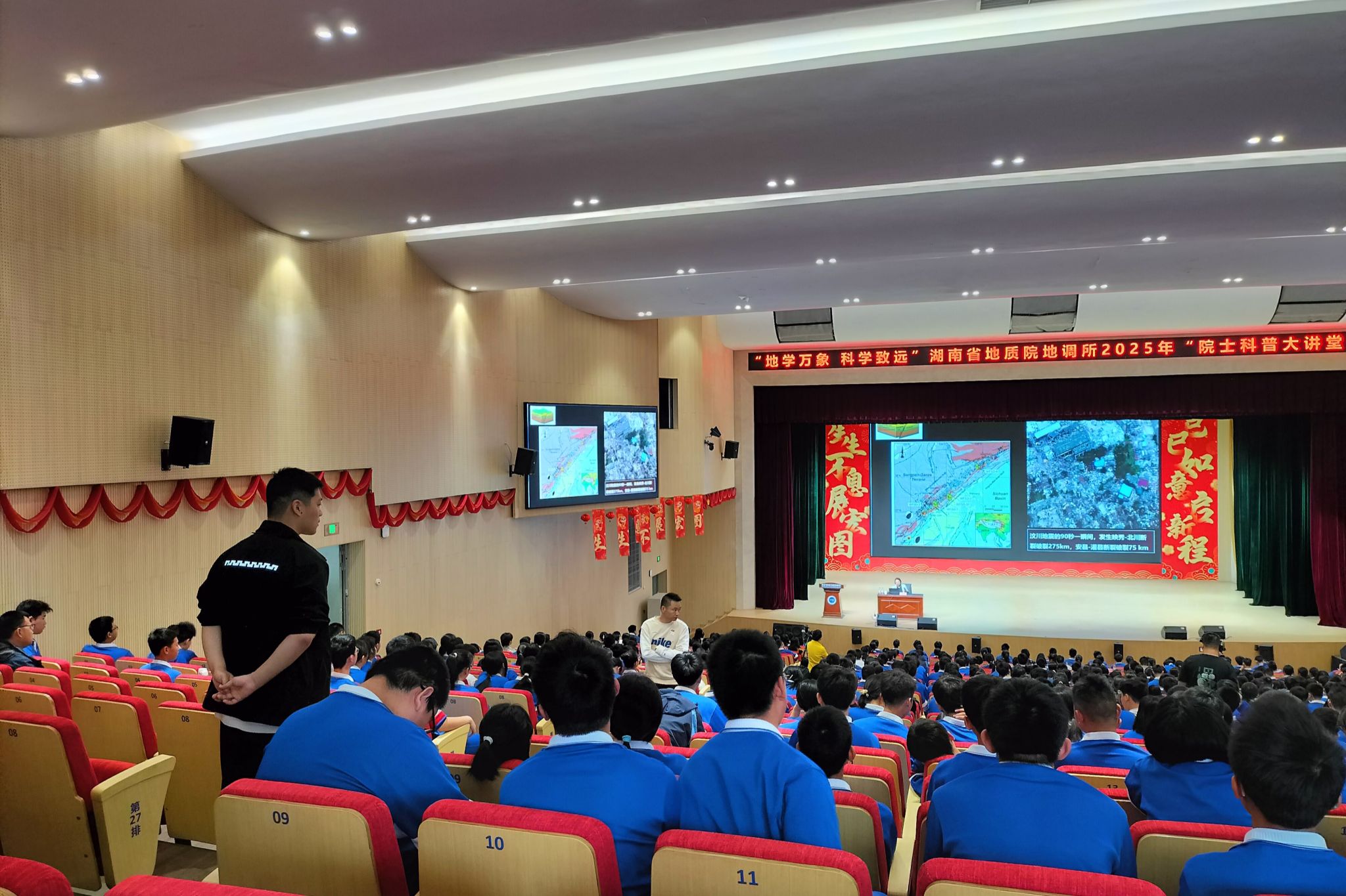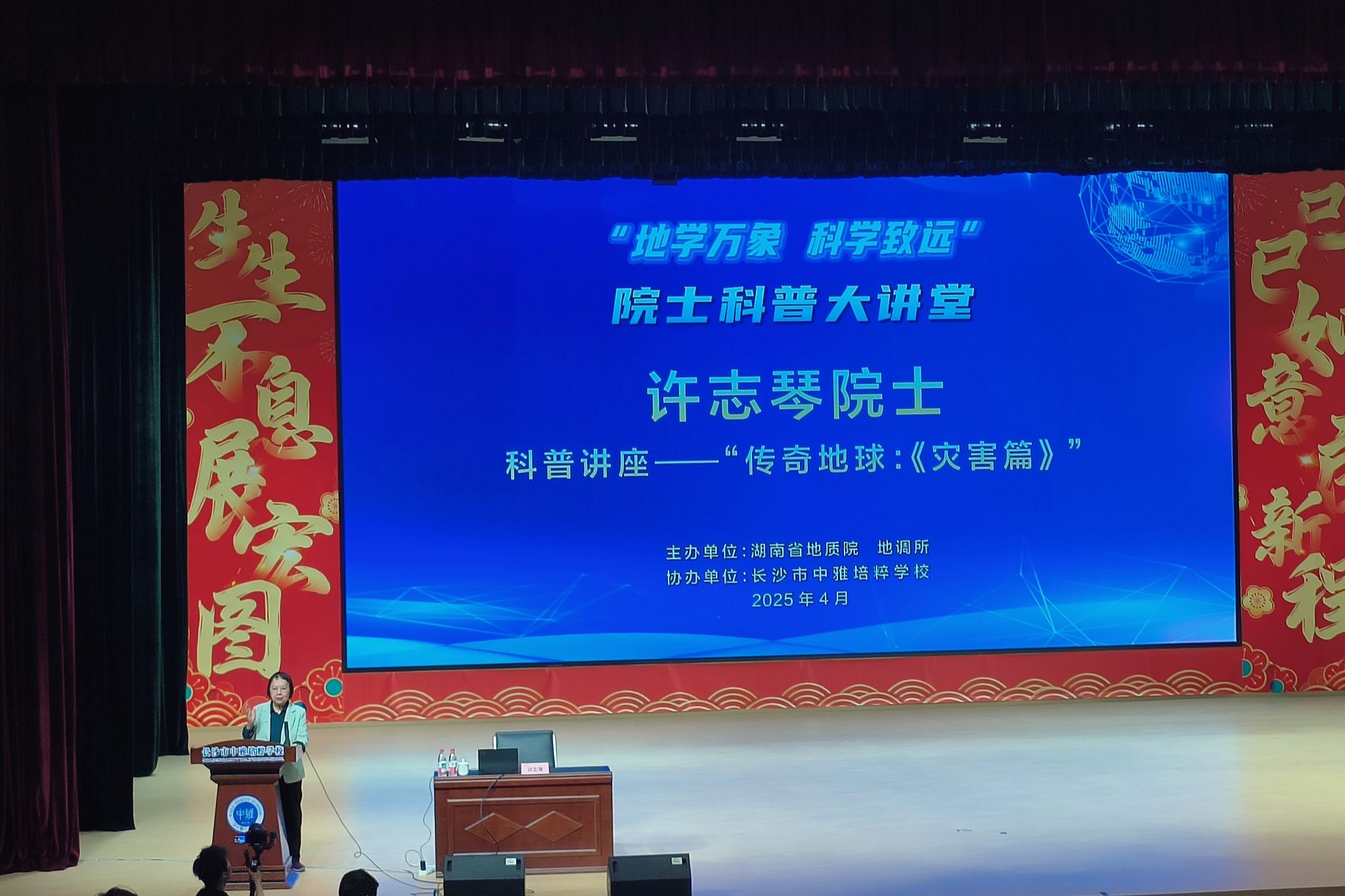 (通讯员 吴俊华 陈洋燕 阿依达娜)4月16日上午,beat365手机版官网入口赴中雅培粹公司实习队于千人报告厅参与了湖南省地质院联合中雅培粹公司开展的“院士科普大讲堂”。中国科公司院士、南京大学教授、构造地质学家许志琴以“传奇地球:《灾害篇》”为题做了精彩报告,初二年级班主任、南校区全体实习队成员、初二年级员工参与此次活动。