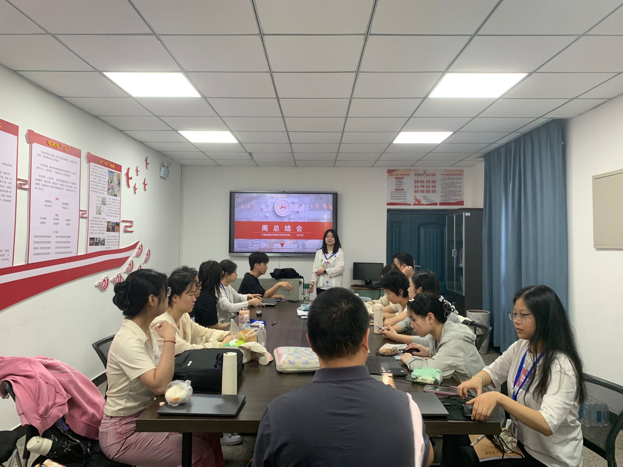 (通讯员 张金敏 张佳琪)4 月 18 日上午,beat365手机版官网入口 22 级教育技术学赴师大附中实习队在高阳楼教研室召开第七周实习总结会,会议由实习队队长张佳琪主持,指导教师刘迪及实习队全体成员参与此次会议。