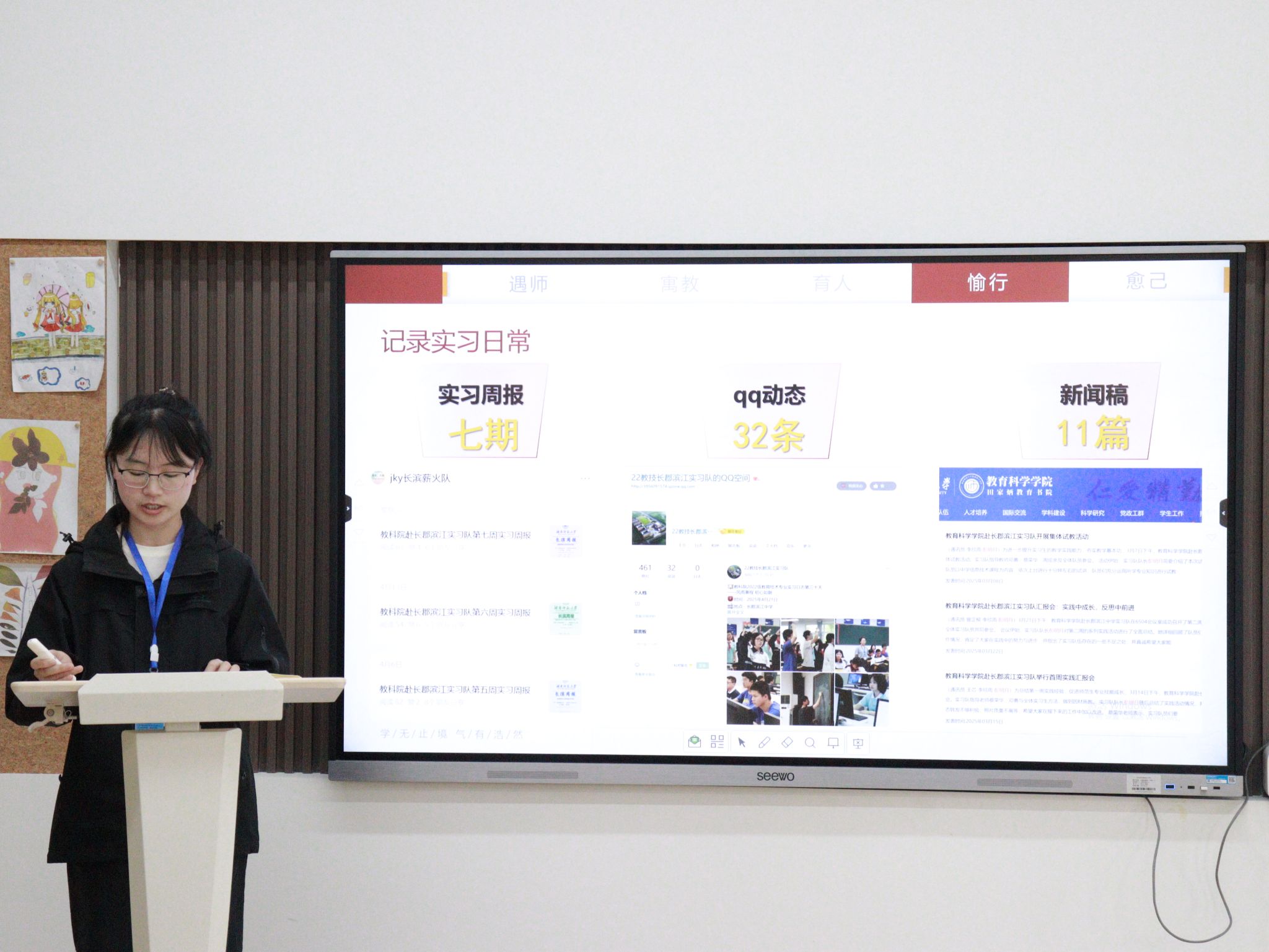 会议伊始,实习队队长彭明月以“遇师、寓教、愉行、育人、愈己”为脉络,系统梳理实习实践成果。她指出,全体队员通过百余节课堂观摩与独立授课,逐步掌握学情分析与教学节奏把控技巧;在班级管理中,从“旁观者”进阶为“参与者”,逐渐形成自己的管理习惯。