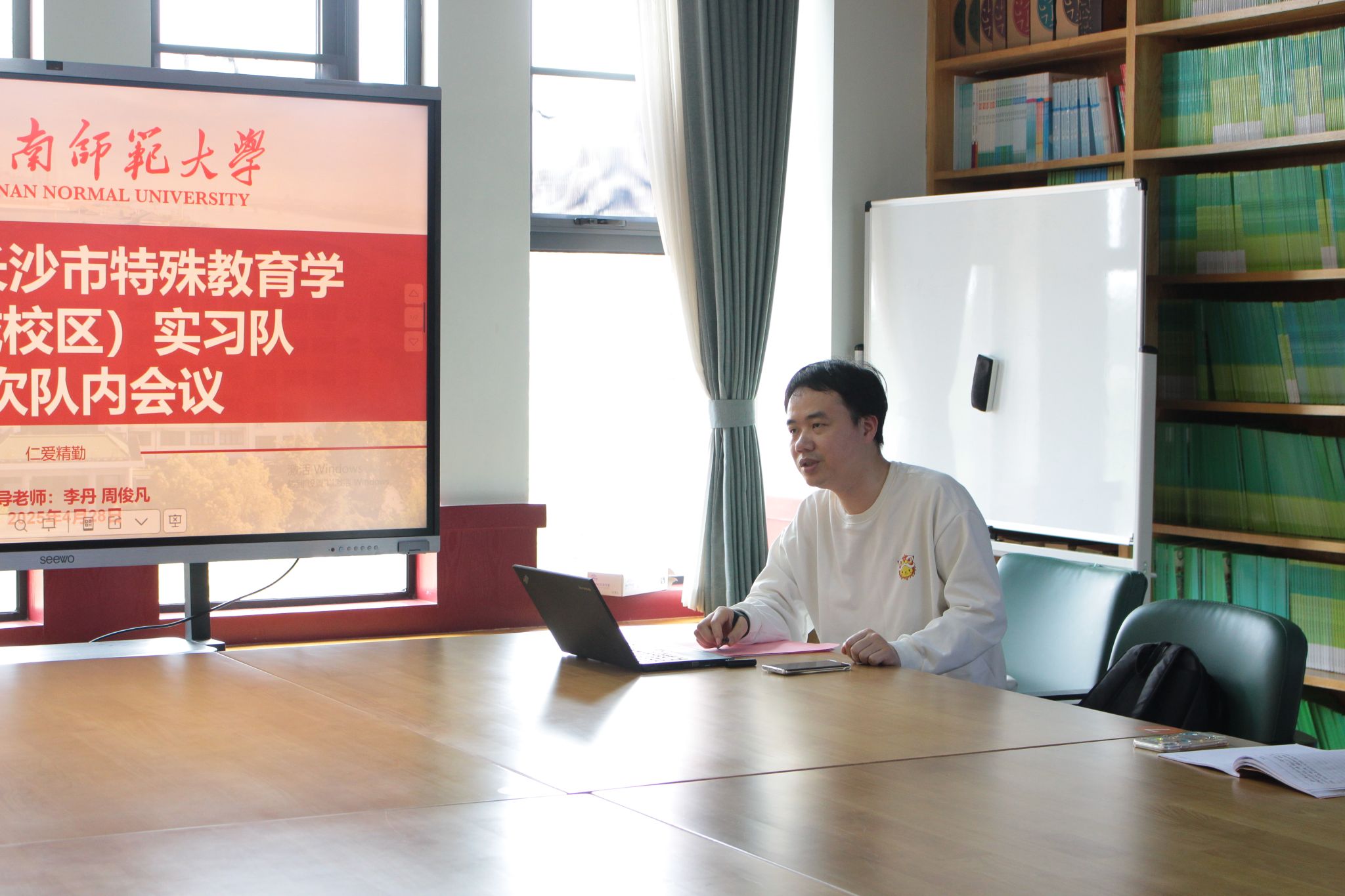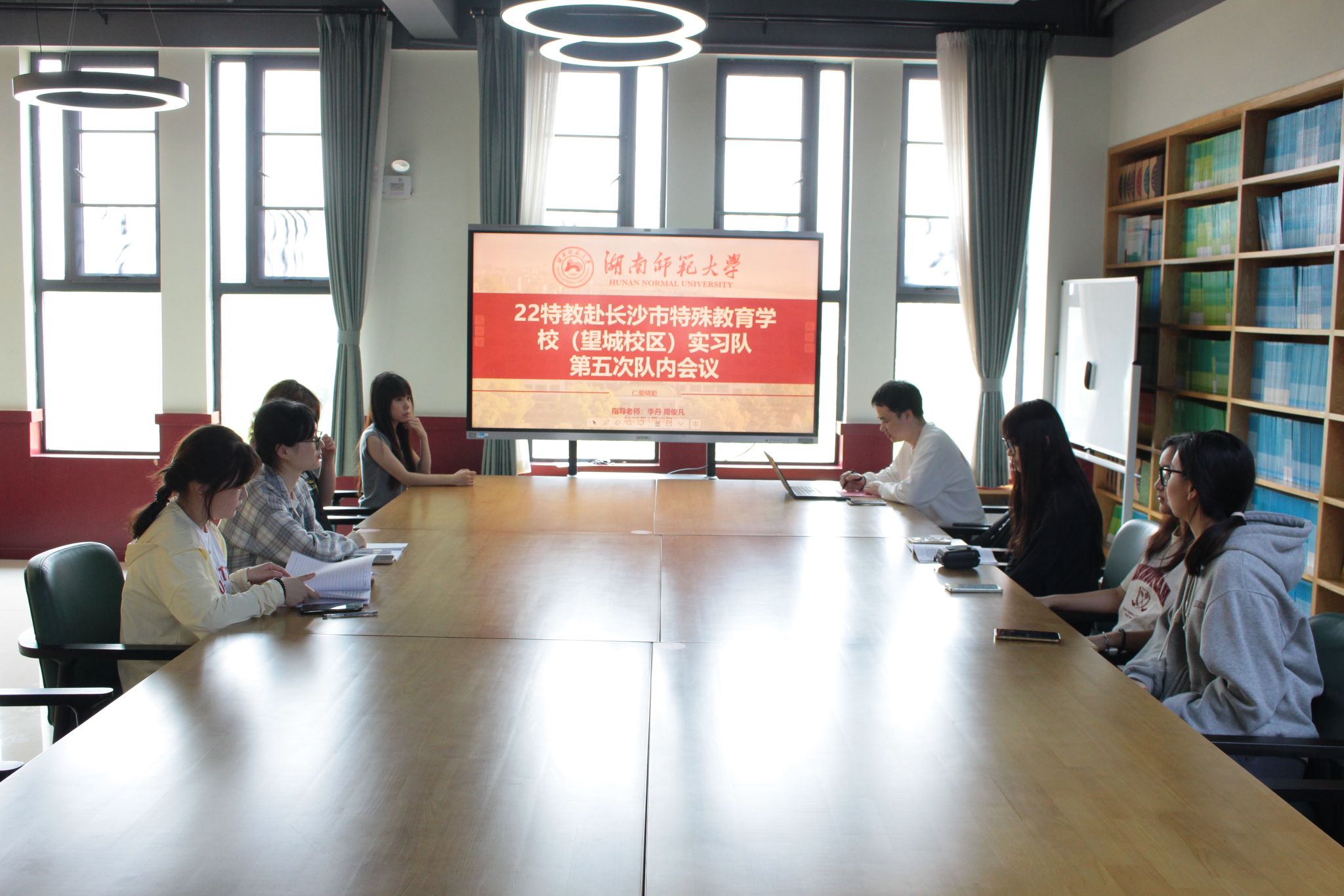 (通讯员 屈清华 向心雨 张芸溪)4月28日中午,beat365手机版官网入口赴长沙市特殊教育公司(望城校区)实习队指导教师周俊凡莅临指导,召开第五次队内会议,针对教学以及生活问题为队员答疑解惑,实习队全体队员参会。