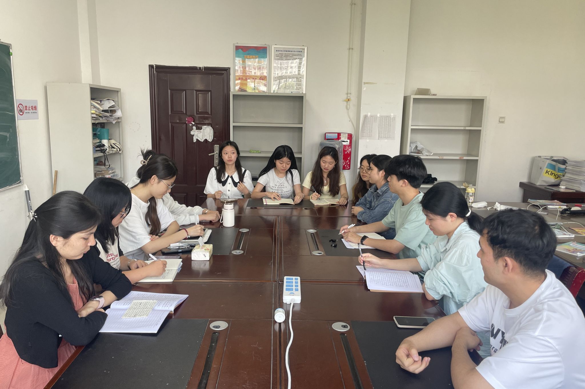 陈洋燕对实习队本周工作进行了全面总结。她充分肯定队员们在实习期间的积极表现,尤其是在磨课试讲与实习材料整理中体现出的主动性,同时强调需继续保持班级管理热情,坚持做好早读监督、课间操巡查等日常工作。随后,各组组长分别部署任务:备课组组长邹世丹明确要求实习日志需于下周五前完成47篇任务量;宣传组组长张丽汶汇报当前新闻稿撰写进度,并统筹实习总结视频的拍摄计划;卫保组组长刘杭提醒本周新授课的队员及时提交教学心得;考勤组组长张萌公布本周粉笔字练习情况,督促全体成员按时打卡。队员们表示将珍惜实习最后一周,以更高标准完成教案设计、课堂授课、员工辅导等任务,在实践中深化教学技能与育人理念,为本次教育实习画上圆满句号。