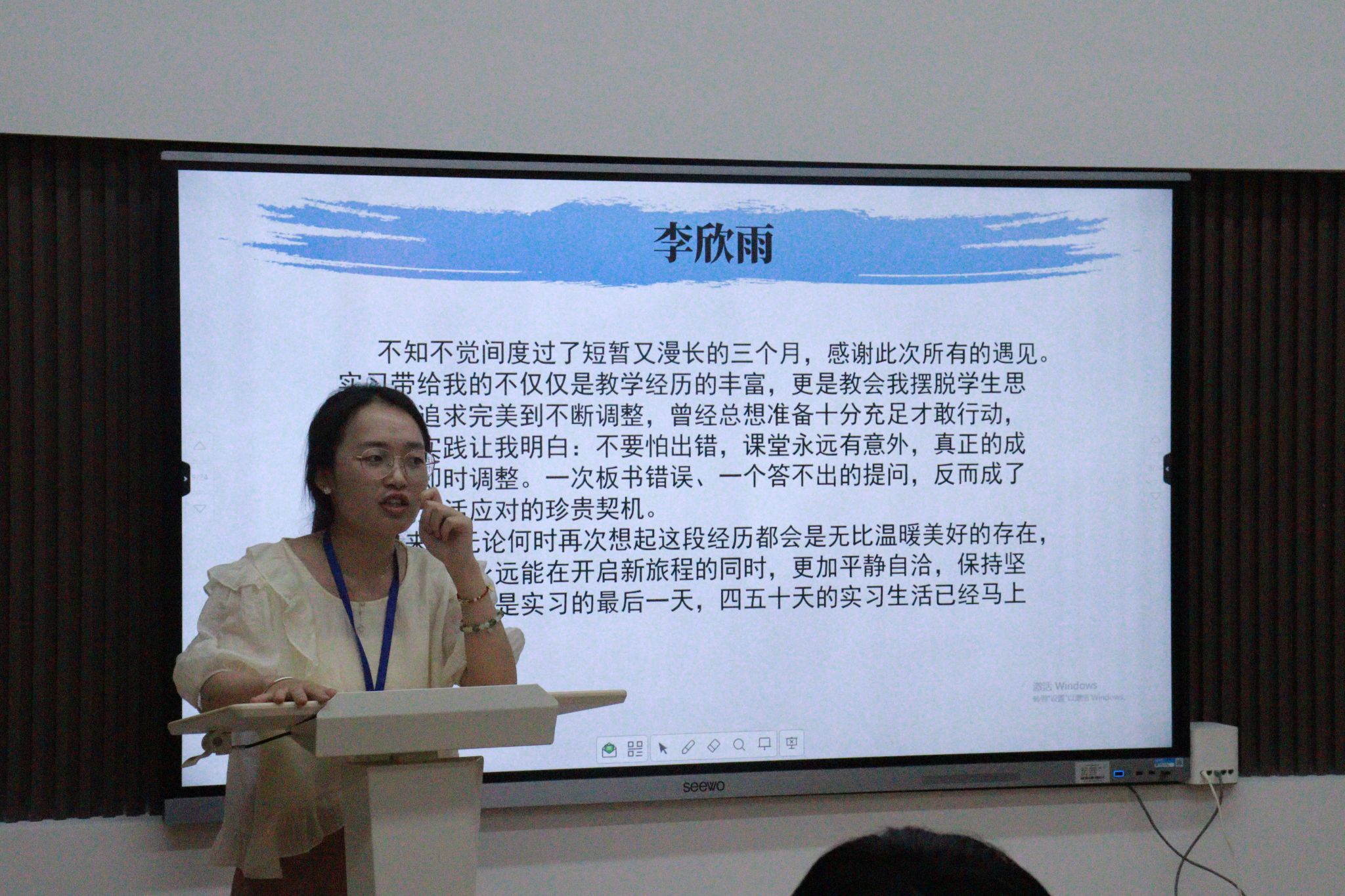 副队长李欣雨上台发言,强调了团队凝聚力的重要性,并表达了对未来的期许,希望大家在实习结束之后也能够常联系,继续保持这份珍贵的团队情谊。