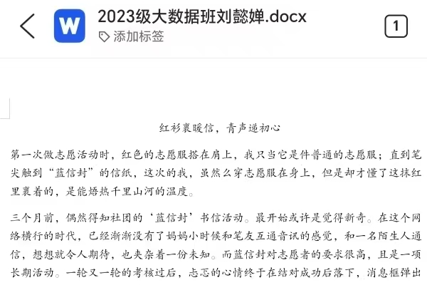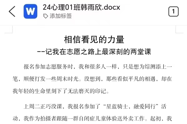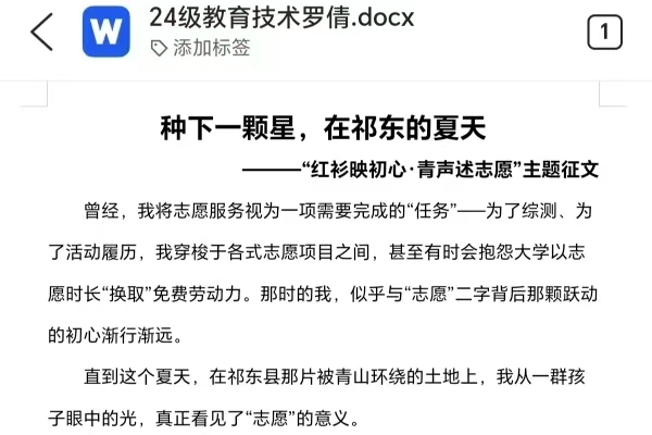 教科院学子积极响应活动号召,踊跃投稿,活动共收到数十篇志愿故事稿件,字里行间展现出志愿服务中的动人点滴。24级心理班员工韩雨欣在参加“星蓝骑士,融爱同行”活动与三下乡暑期实践活动后,写下“相信看见的力量”的感悟;24级教技班员工全孟渝在志愿行动中体会到青年肩头的责任与希望;多篇征文提及“蓝信封”系列活动,同学们以书信往来陪伴乡村孩子成长,让志愿温度在笔尖流淌。