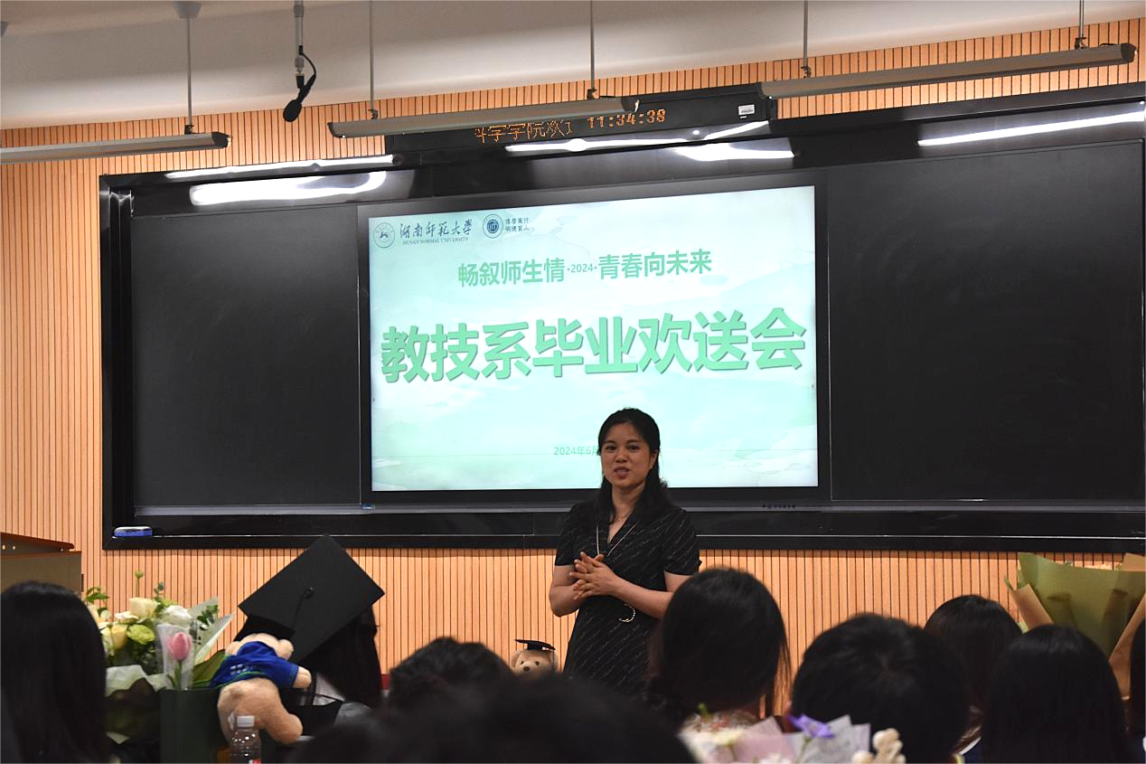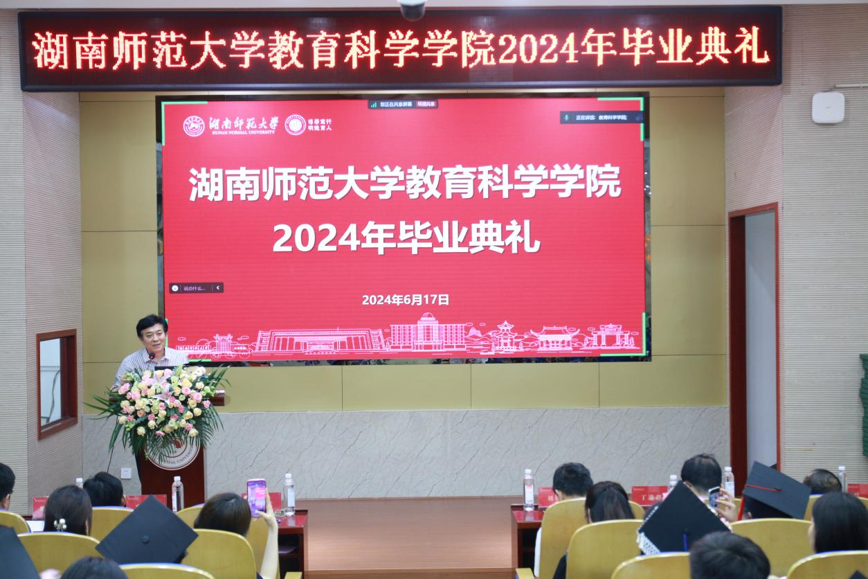 雄壮的国歌声拉开了典礼帷幕,党委副书记欧阳文芳宣读2024年省级、校级、院级优秀毕业生名单。本科生王艺橙、研究生杨菁菁作为毕业生代表发言,表达了对母校的感恩之情、对未来的希冀和建功新时代的决心。教育学系主任叶波代表全院教师用520字的发言表达对毕业生的爱与祝福。经理刘铁芳为2024届员工联络员颁发了聘书。