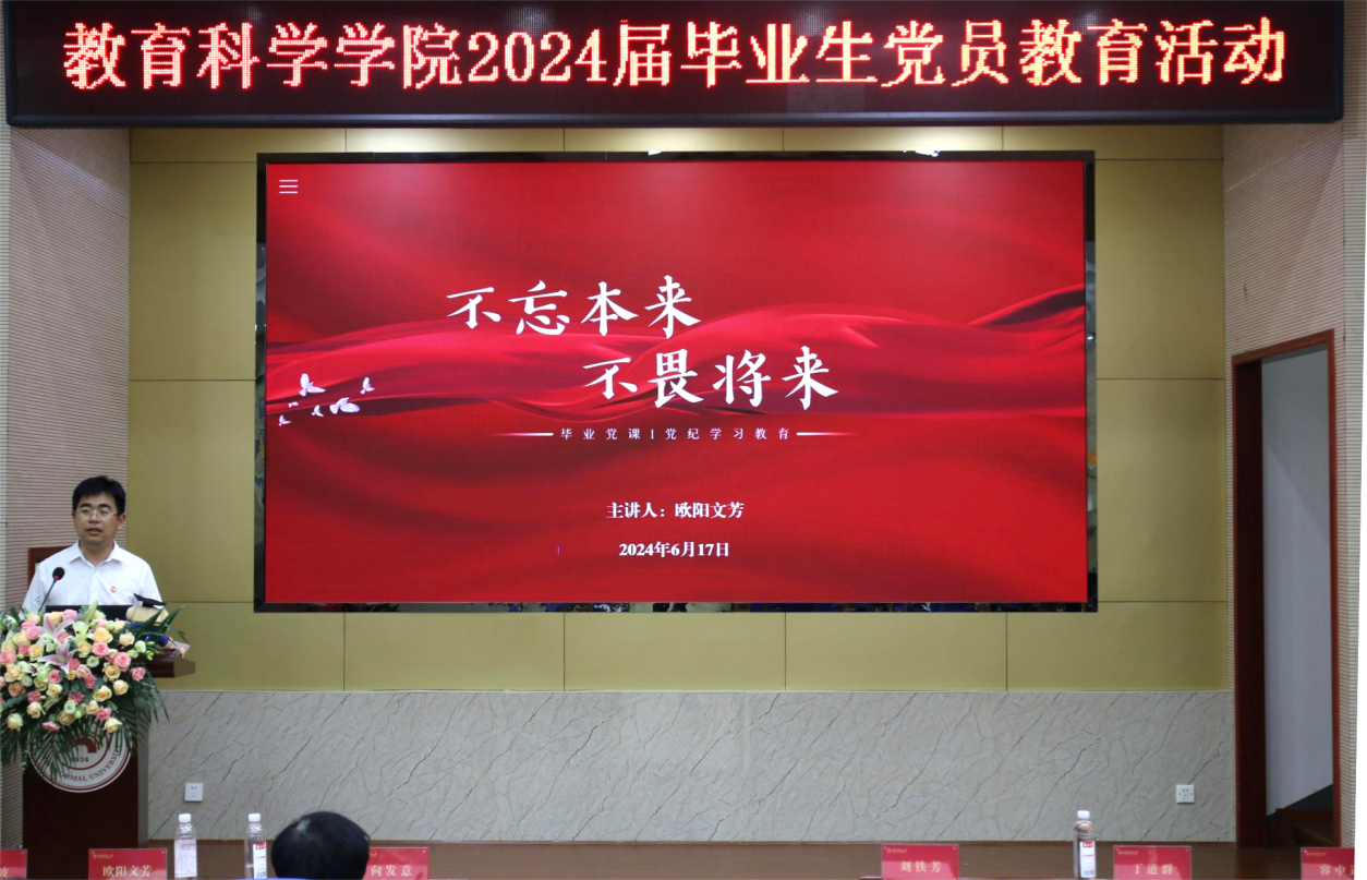 在向发意的带领下,全体毕业生党员重温入党誓词,随后党员王宇轩、李子鸣讲述《焦裕禄严守党纪的故事》。欧阳文芳以“不忘本来,不畏将来”为主题,为毕业生党员开展了最后一堂党课,强调要牢记党员第一身份,加强纪律性,坚守原则和立场,努力做到不负人民期望、不负党的嘱托。