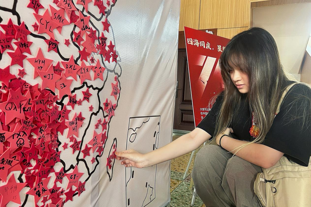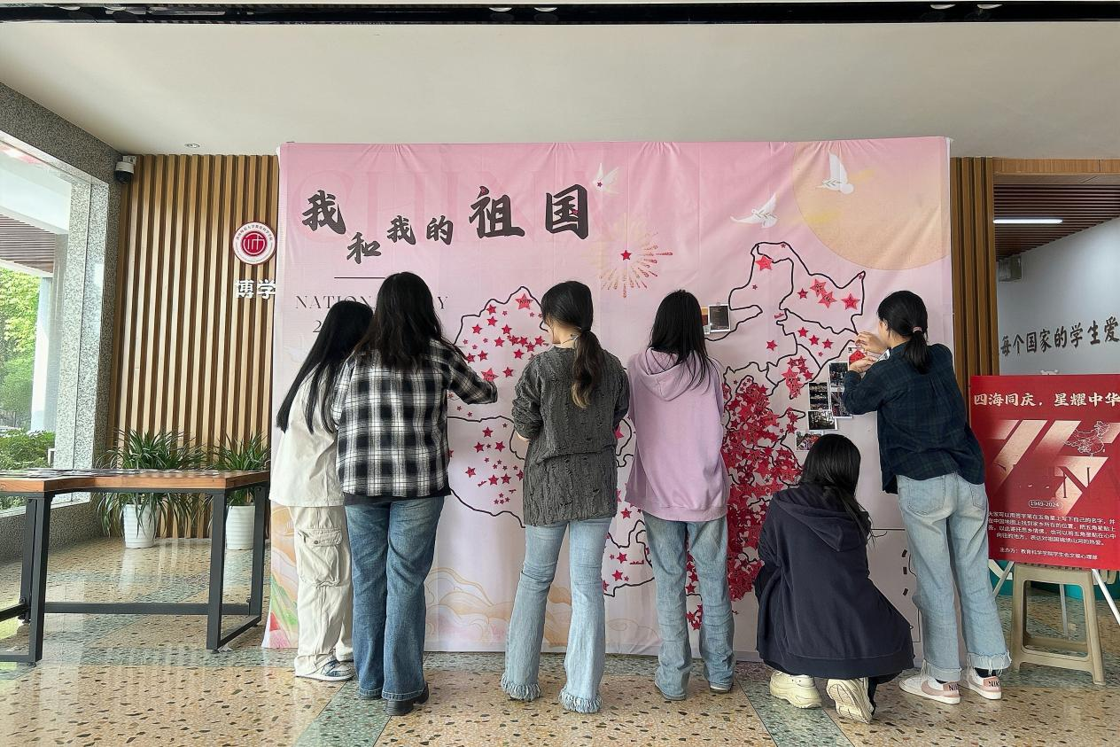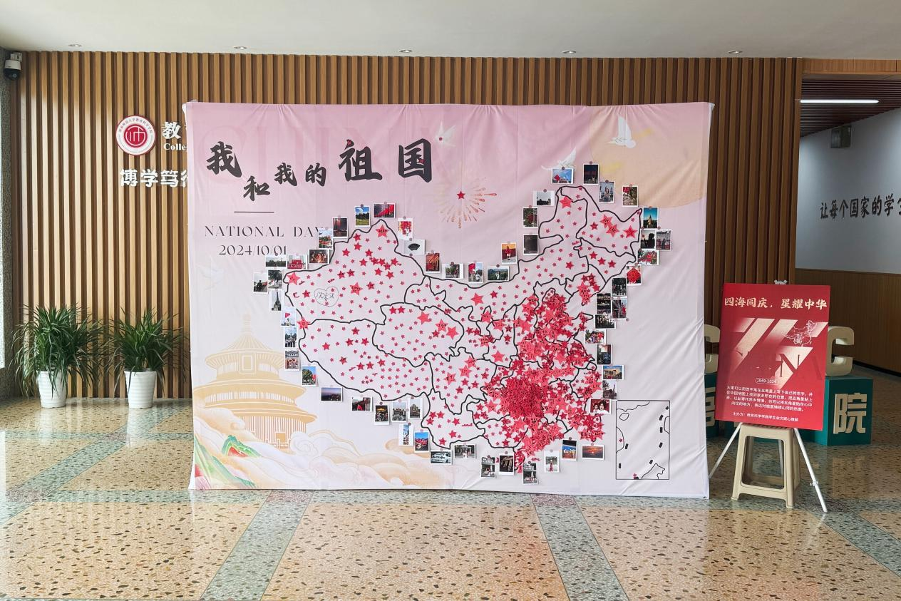 “四海同庆,星耀中华”活动中,文娱心理部工作人员在公司一楼摆放了绘制有中国行政区划图的大型展板同学们将写有自己姓名的红色五角星粘贴到家乡所在之处,以寄托对家乡的思念与对祖国大地的热爱。