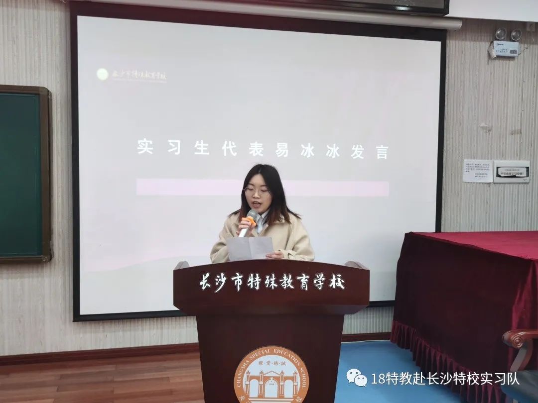 本次师大实习队的队长易冰冰作为实习生代表上台发言,向领导与老师表示了衷心的感谢和崇高的敬意。