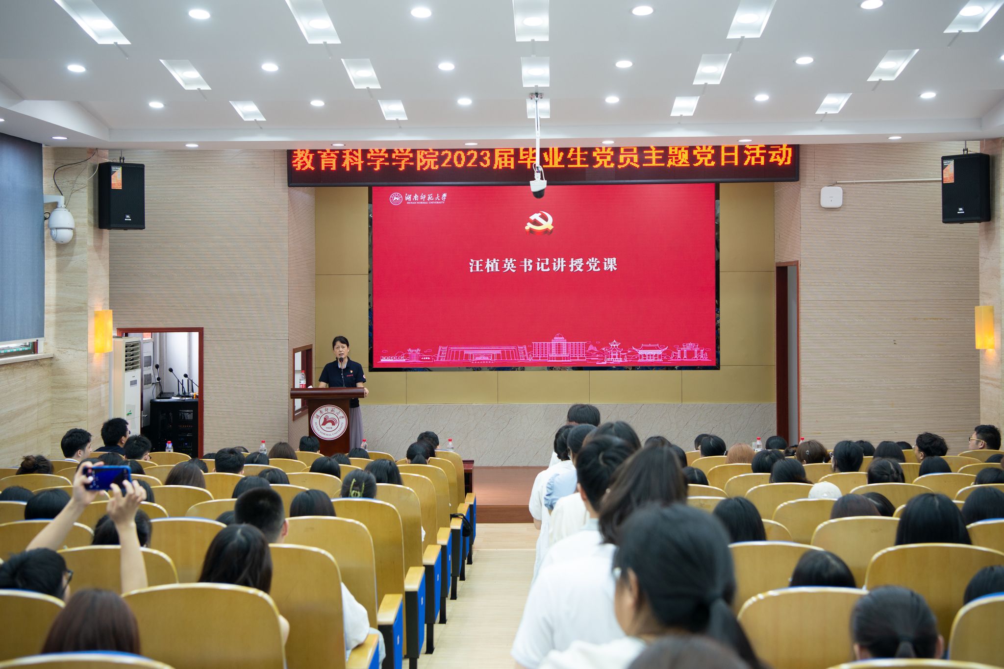 汪植英为毕业生党员讲授了《开启学习新征程 开创未来新辉煌》的主题党课。她从自身的党务工作实践经验出发,与毕业生党员分享了自己在师大工作39年的经历与感悟。她从“学习”“忠诚”“底线”“认真”等四个关键词入手,鼓励毕业生党员在未来的学习与生活中“学知识、强本领”,更好地担当时代责任,走好、走稳人生路,奋力为国家富强和民族复兴事业添砖加瓦,争做栋梁之才,为母校增光添彩。